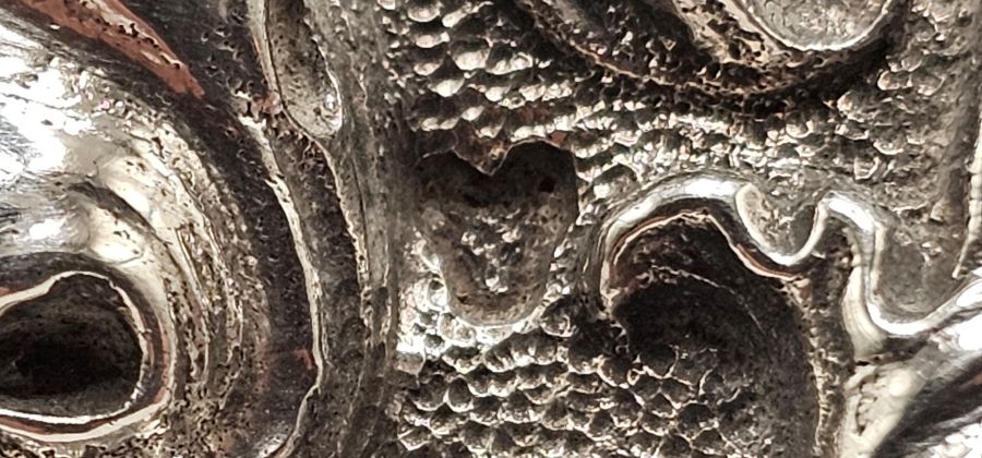 Altezza x larghezza x profondità: 19,5 x 30 x 19 cm. Peso: 2318 gr. di forma rettangolare, la base riccamente decorata con motivi a volute fogliate con quattro putti alati sugli angoli.