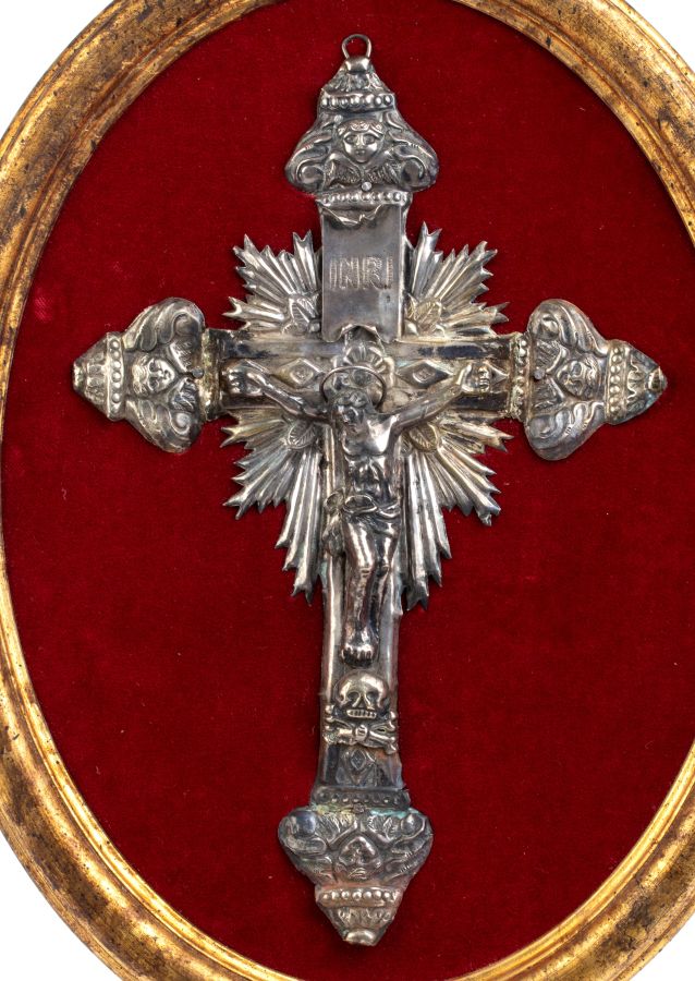 Altezza x larghezza crocifisso: 35 x 23; dimensioni teca: 46 x 36 cm. Peso con teca: 665 gr. Corpus Christi posto su una croce con terminali raffiguranti teste cherubiche. Il Salvatore è raffigurato con la testa coronata di spine china a destra, gambe piegate e piedi sovrapposti e inchiodati uno sull'altro; le braccia sono distese, con la muscolatura ben evidenziata; le mani, aperte, sono inchiodate alla croce mediante chiodi a forma piramidale; il perizoma è arricchito da un drappo laterale annodato sul fianco destro. Nella parte superiore della croce è presente un cartiglio icon il Titulus Crucis I.N.R.I. (Iesus Nazarenus Rex Iudeorum, che si traduce letteralmente in “Gesù Nazareno, Re dei Giudei”), di forma rettangolare e disposto orizzontalmente in modo ondulato, a richiamo di una pergamena. In basso il teschio simbolo del calvario.