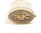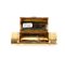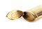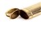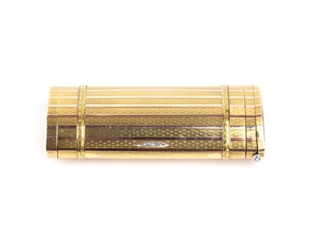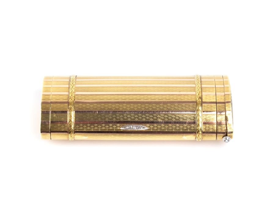 Altezza x larghezza x profondità: 2,5 x 10,5 x 4,3 cm. Peso: 135 gr. in oro giallo 14k, di forma cilindrica ed ellittica, presenta una raffinata lavorazione guilloché, intervallata da fasce lisce verticali. Alle estremità, è ornata da due ghirlande orizzontali di foglie finemente cesellate. Al centro, l’apertura è impreziosita da un dettaglio in oro bianco incastonato con diamanti taglio a rosa.