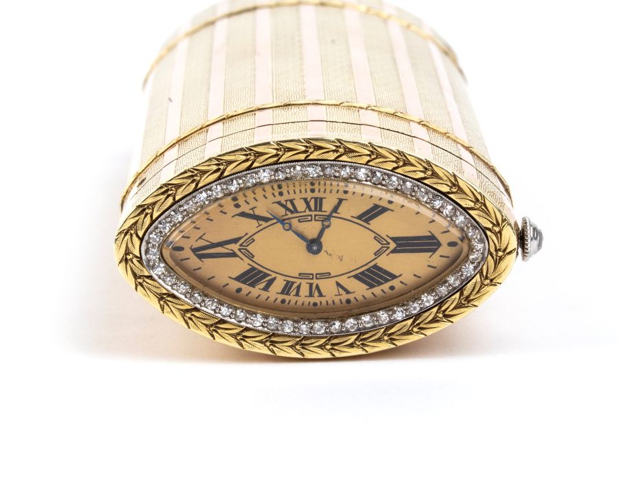 Tabacchiera con orologio in oro e diamanti Inizio XX secolo Altezza x...