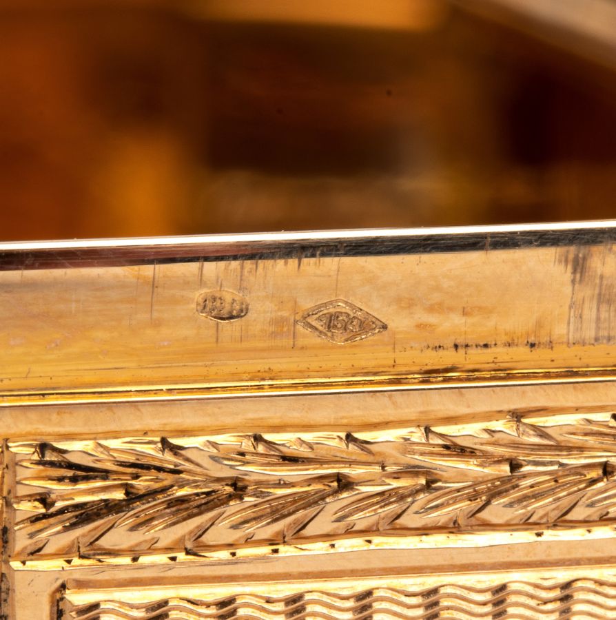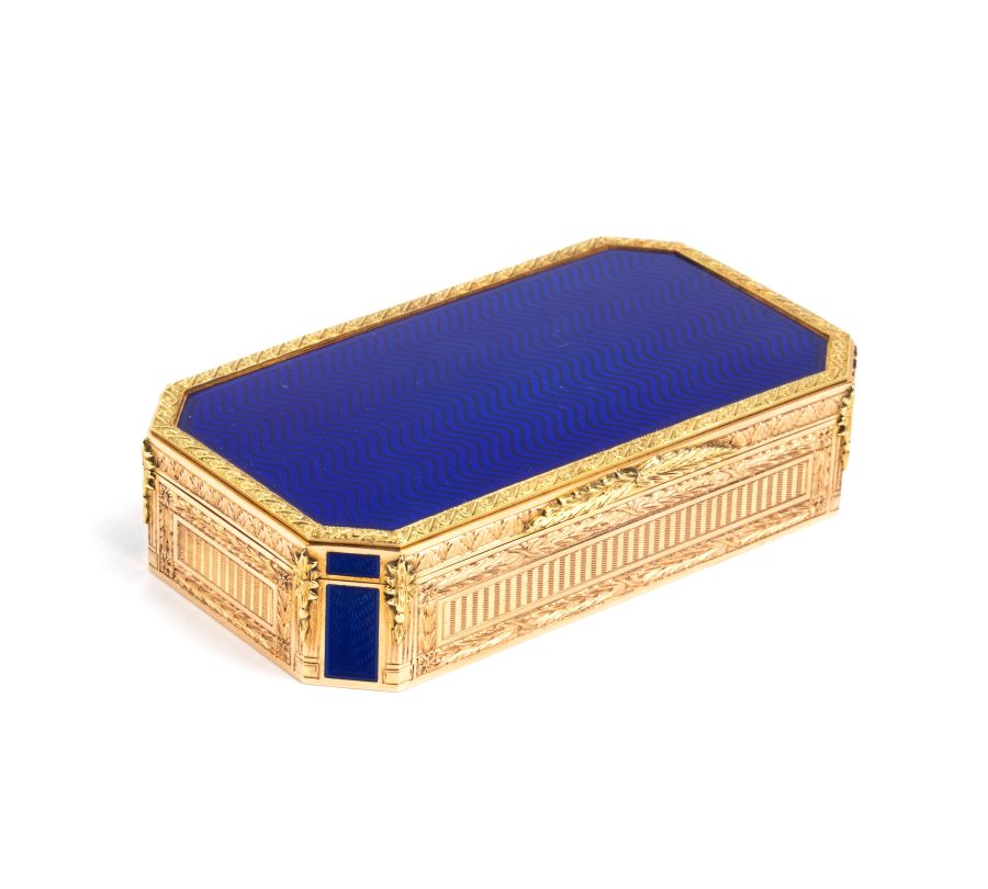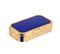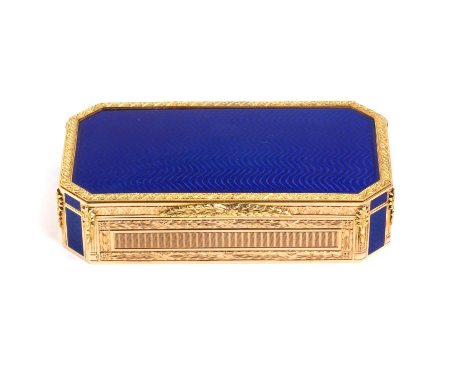 Altezza x larghezza x profondità: 2 x 9 x 5 cm. Peso: 133 gr. in oro giallo 18k, di forma rettangolare con angoli smussati, finemente decorata a guilloché ed elementi vegetali su tutta la superficie, il coperchio ed i quattro angoli in smalti guilloche nei toni del blu.