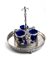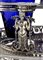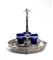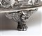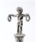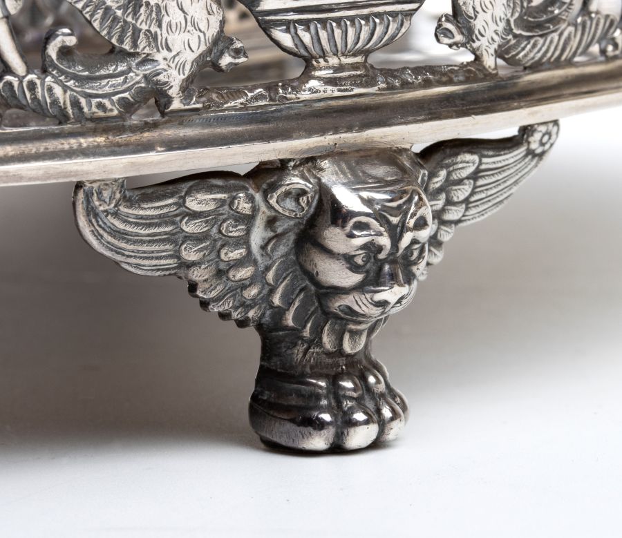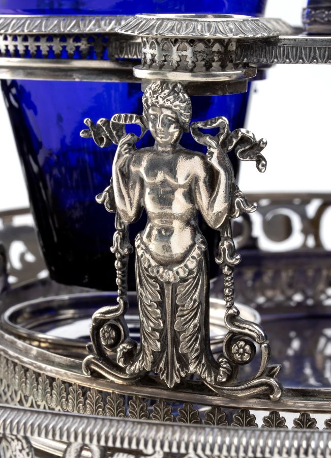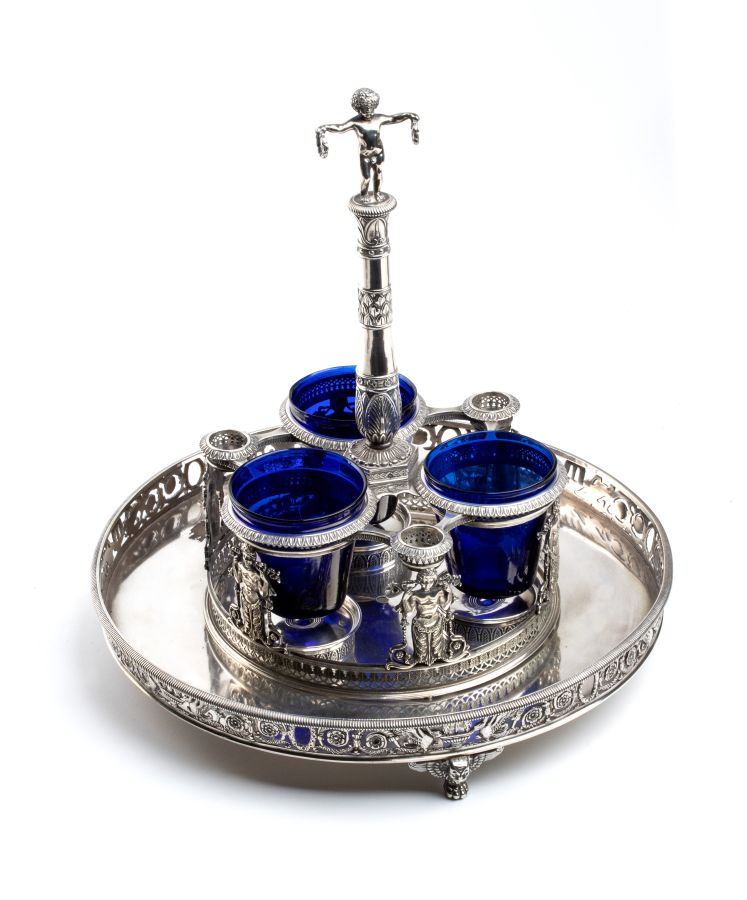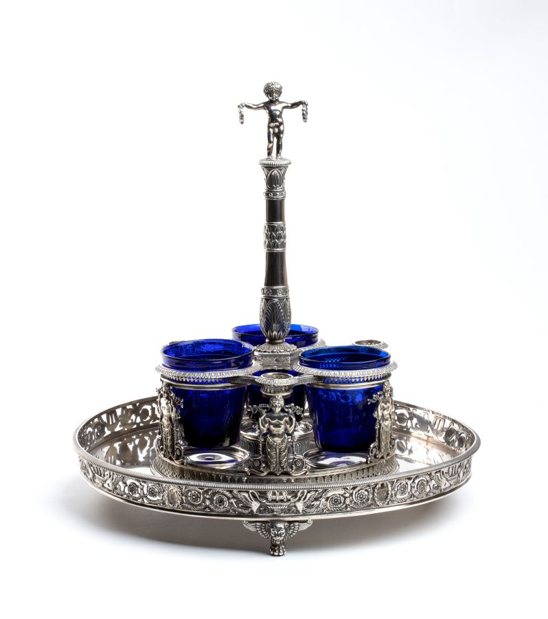 Altezza x diametro: 32,5 x 30 cm. Peso lordo complessivo: 2180 gr. Peso netto: 1855 gr circa. di forma circolare con ringhiera decorata a motivi vegetali stilizzati e ghirlande, poggiante su tre piedi ad artiglio con teste leonine alate; porta liquori superiore con decoratazion e perimetrale a palmette e figure mitologiche, che si intrecciano nei porta liquori e nei porta tappi. Presa centrale cimata da un putto stante, nudo, con le braccia aperte a sorreggere due ghirlande. Vetri non coevi.