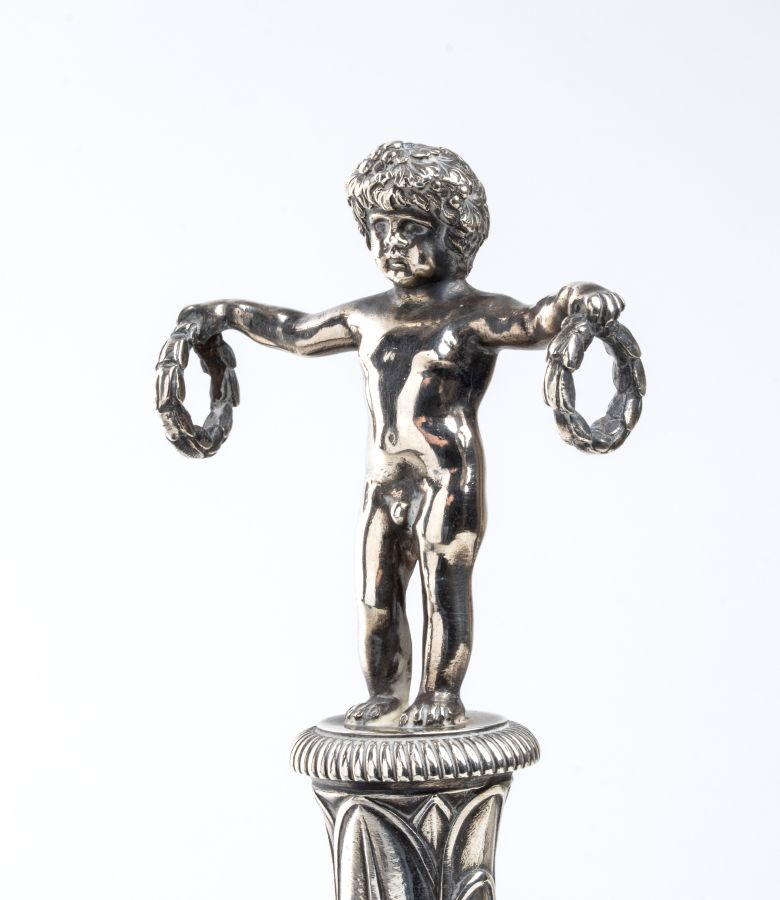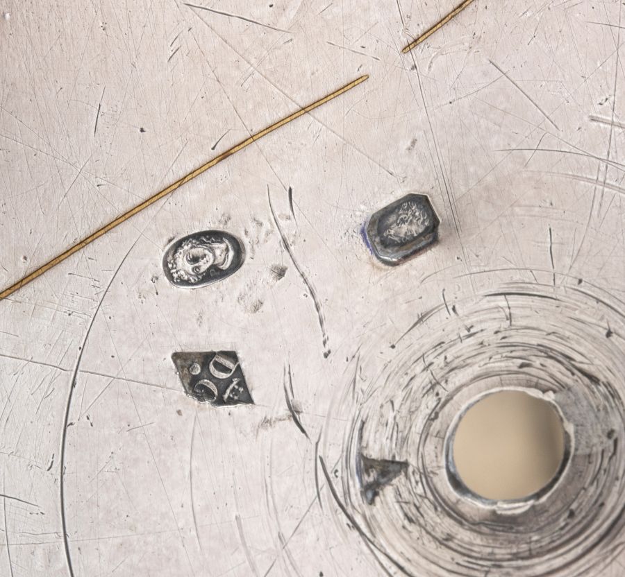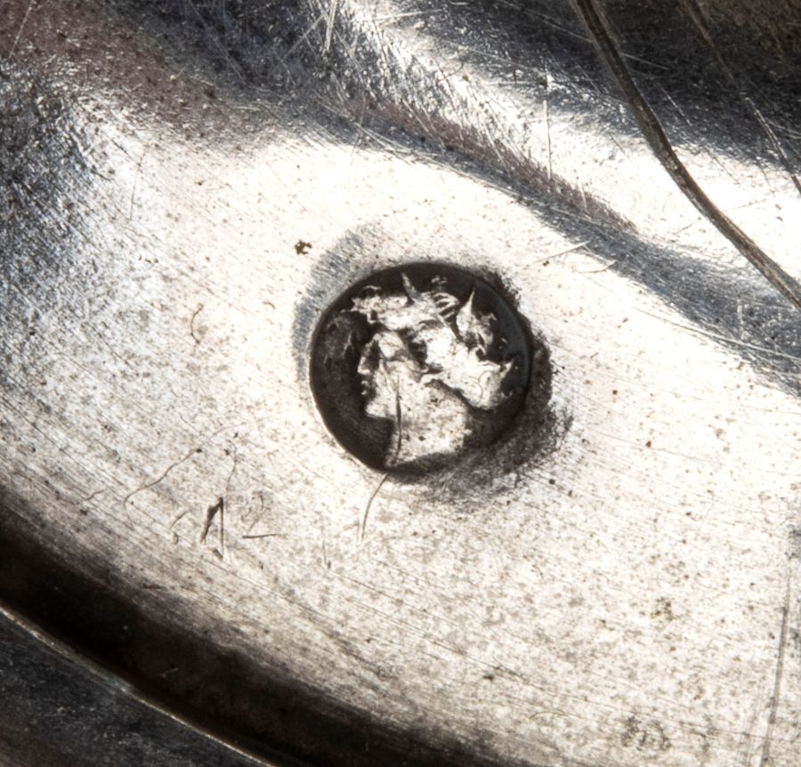 Punzonato con i marchi di garanzia francesi per l'argento al primo titolo di 950/1000 in uso a Parigi dal 1819 al 1838, con il marchio non ufficiale utilizzato dall'Association des Orfévres di Parigi rappresentato dalla testa di donna greca con la lettera P e con il marchio di un argentiere non identificato.