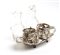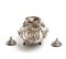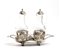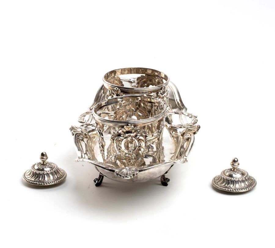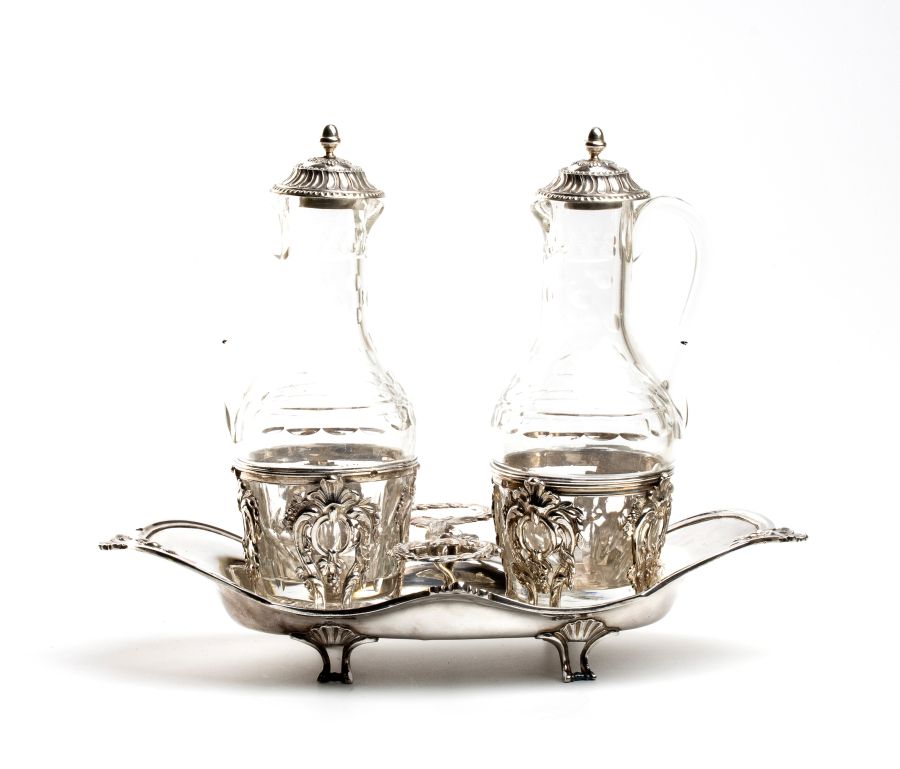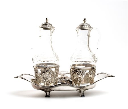 Altezza x larghezza x profondità: 20 x 29 x 12 cm. Peso complessivo lordo: 1540 gr circa. Peso netto dell'argento: 710 gr circa. di forma ovale, poggiante su quattro piedini decorati a motivi vegetali stilizzati. Le oliere, probabilmente non coeve, sono dotate di due tappi decorati con baccellature e presa a forma di vite e ghianda.