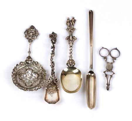 Gruppo di quattro cucchiai e un paio di forbici in argento Inghilterra, fine XIX secolo.