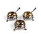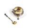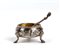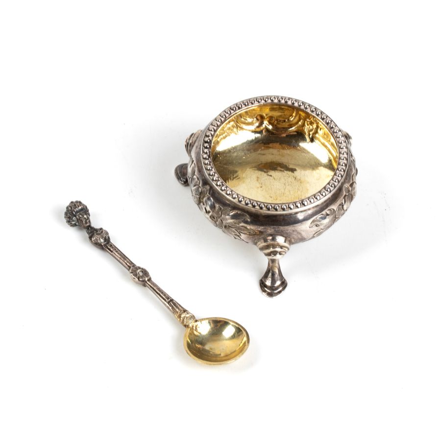 Altezza x larghezza x profondità saliera: 3 x 5,5 x 5,5 cm. Lunghezza cucchiaino: 7 cm. Peso complessivo: 100 gr circa. di forma circolare poggianti su piedini a zoccolo equino, il corpo decorato con elementi floreali, interno dorato; accompagnate da cucchiaini con terminali ad erma.