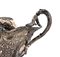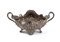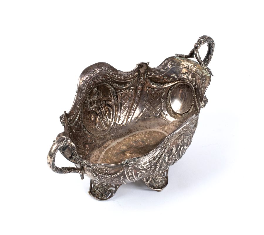 Altezza x larghezza x profondità: 12 x 26 x 14 cm. Peso: 440 gr circa. corpo ovoidale, lavorato a sbalzo e cesello con scene mitologiche e ghirlande con fiori e frutti, con manici a motivi floreali; poggiane su quattro piedini lavorati a traforo con motivi vegetali e floreali.