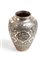 Altezza x diametro: 18x13,5 cm. Peso: 474 gr. corpo globulare che si restringe verso un collo stretto, sormontato da un piccolo orlo svasato. La superficie è interamente decorata a sbalzo e cesello, con motivi arabescati intrecciati, motivi floreali stilizzati e figure di animali.