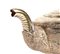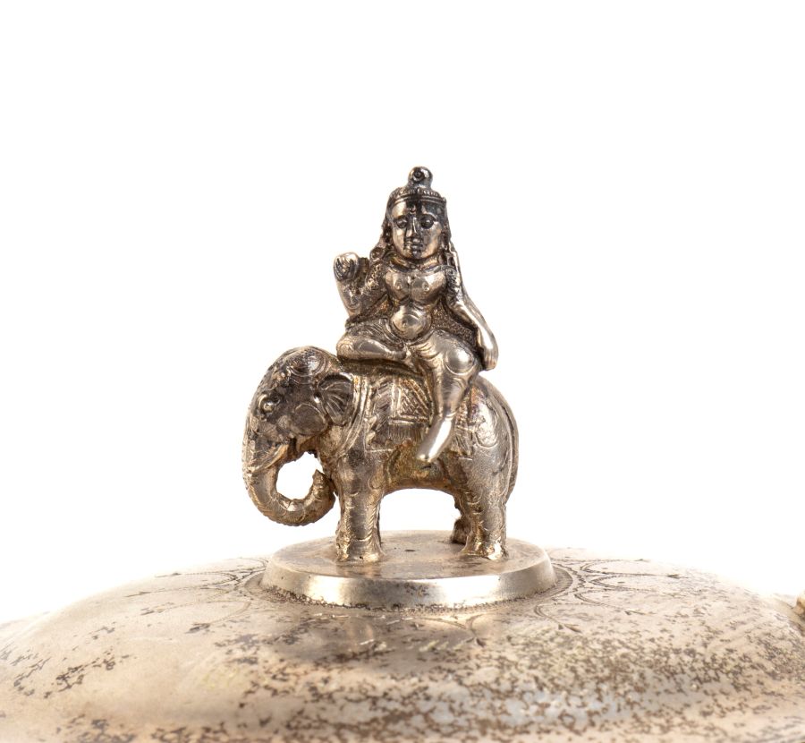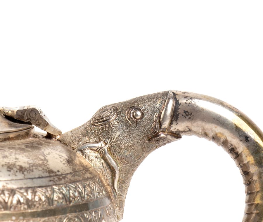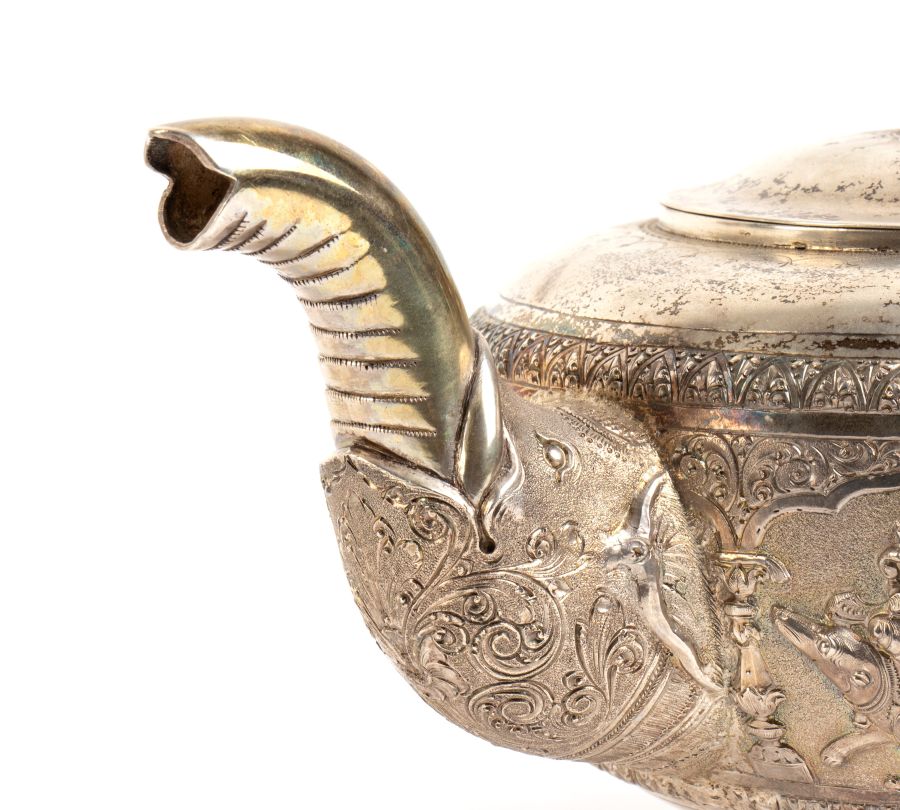 Altezza x laghezza x profondità: 14x14x23 cm. Peso: 621 gr. a forma di melone su base circolare. Il corpo, ampio e bombato, è interamente decorato con scene realizzate a sbalzo e a cesello, in perfetto stile della tradizione orafa birmana. Il manico ornamentale si distingue per la presenza di una testa d’elefante scolpita, con la proboscide in rilievo, mentre anche il beccuccio riprende la figura dell’elefante. Il coperchio incernierato è impreziosito da una piccola figura decorativa posta sopra un elefante.