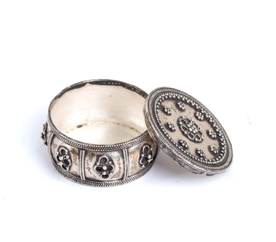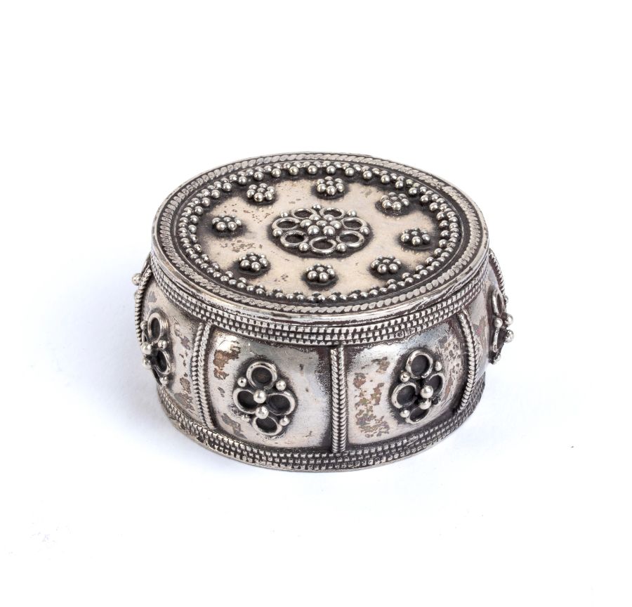 Piccola scatola Birmana in argento XIX secolo Altezza x diametro: 2x5,5 cm....