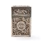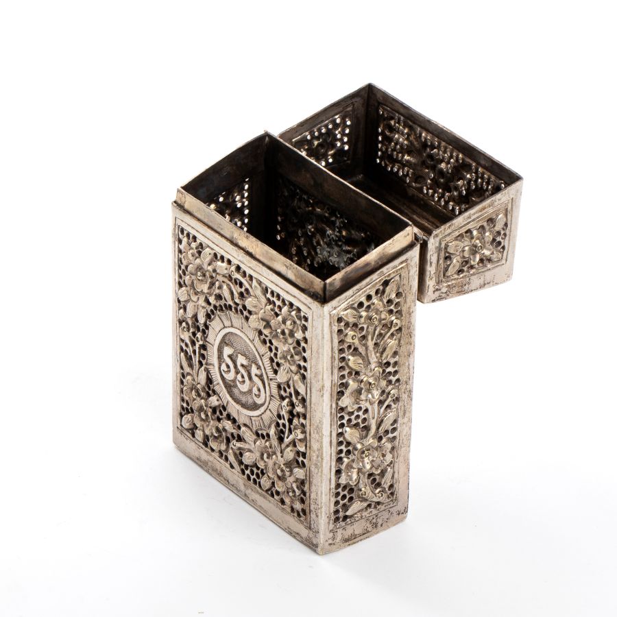 Altezza x larghezza x profondità: 9,8 x 6,5 x 3 cm. Peso: 138 gr. in metallo argentato con motivi floreali e trafori.