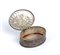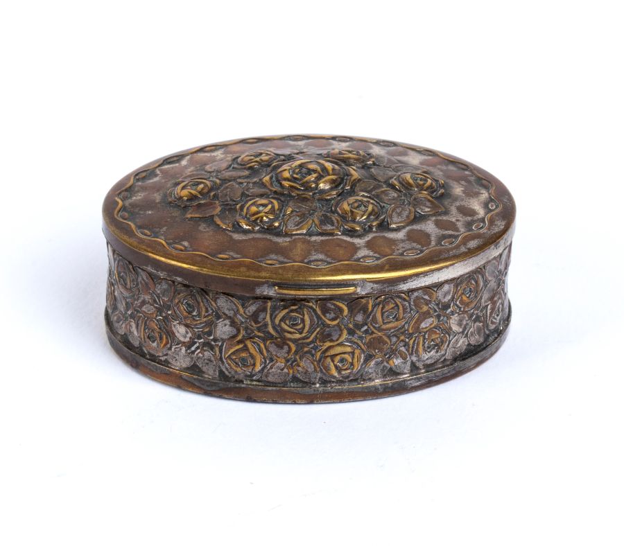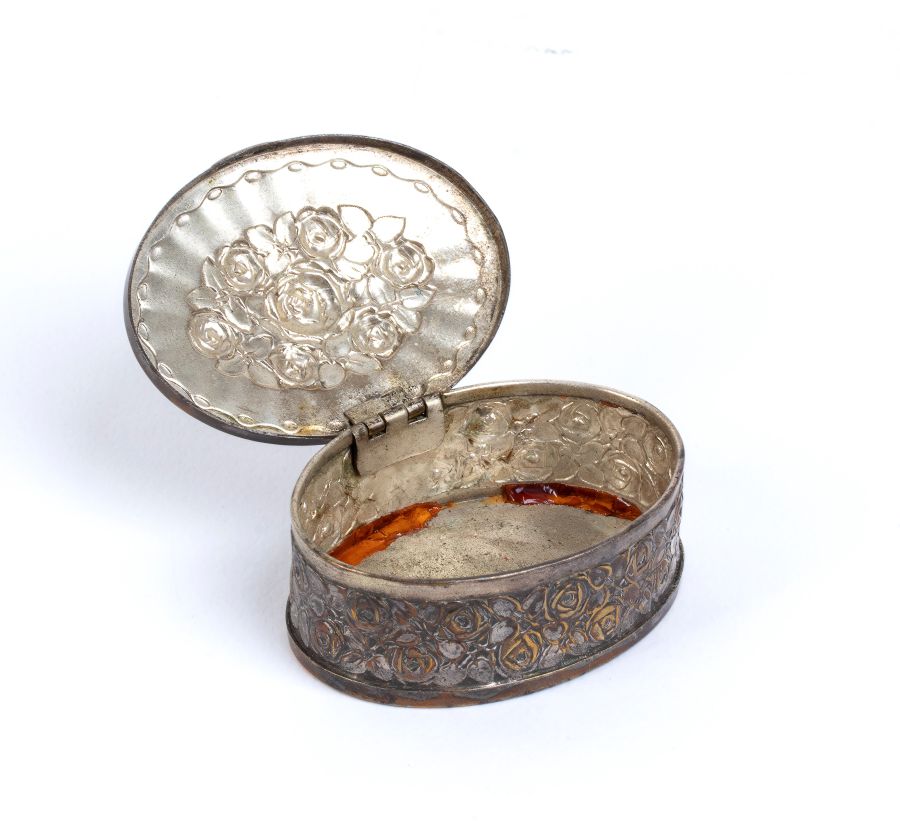 Altezza x laghezza x profondità: 2x5x6,5 cm. Peso: 44 gr. di forma ovale, con coperchio incernierato. L'intero corpo è decorato a sbalzo e cesello con motivi fogliati e a rose.
