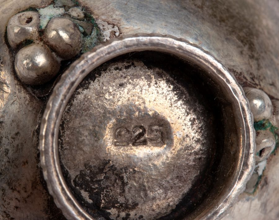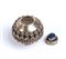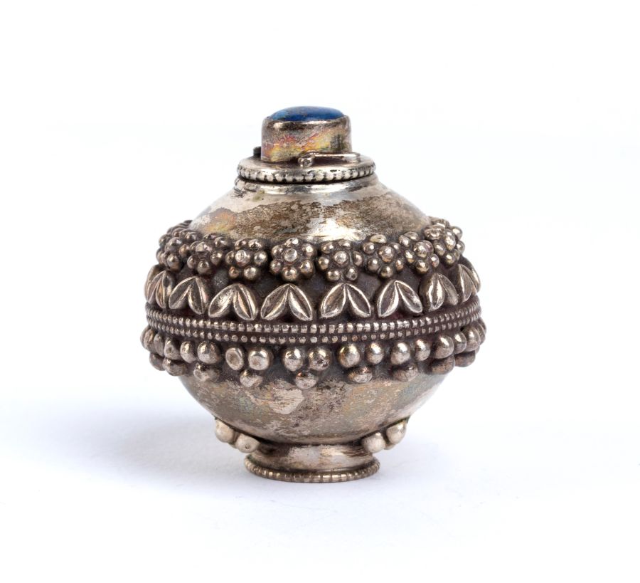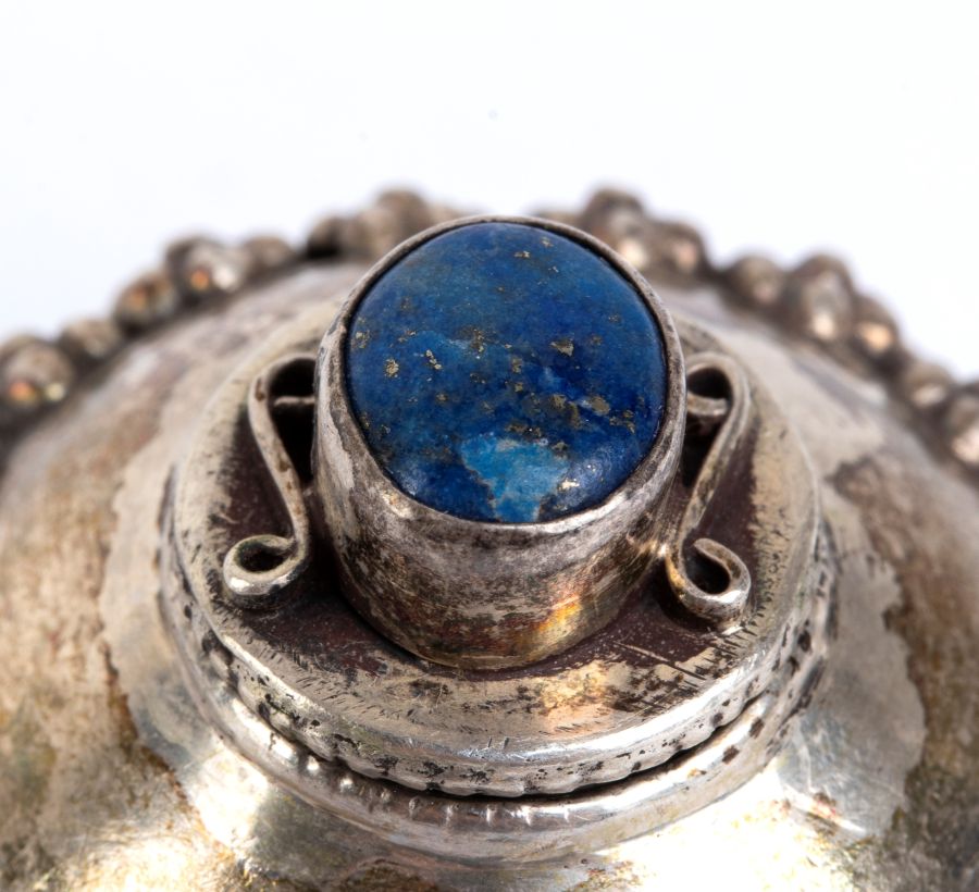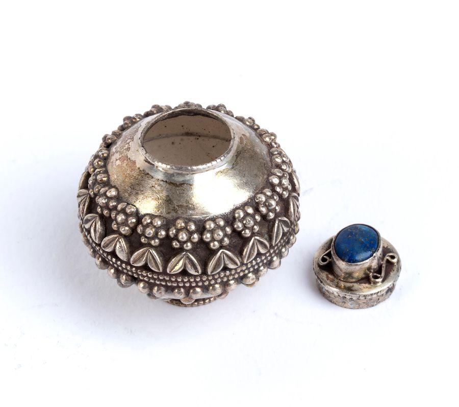 Altezza x diametro: 4,5 x 4 cm. Peso: 29 gr. di forma rotonda, decorata con elementi floreali e grani lungo il corpo liscio; poggiante su base rotonda e decorato nella parte superiore con un cabochon di lapislazzuli. Non apribile.