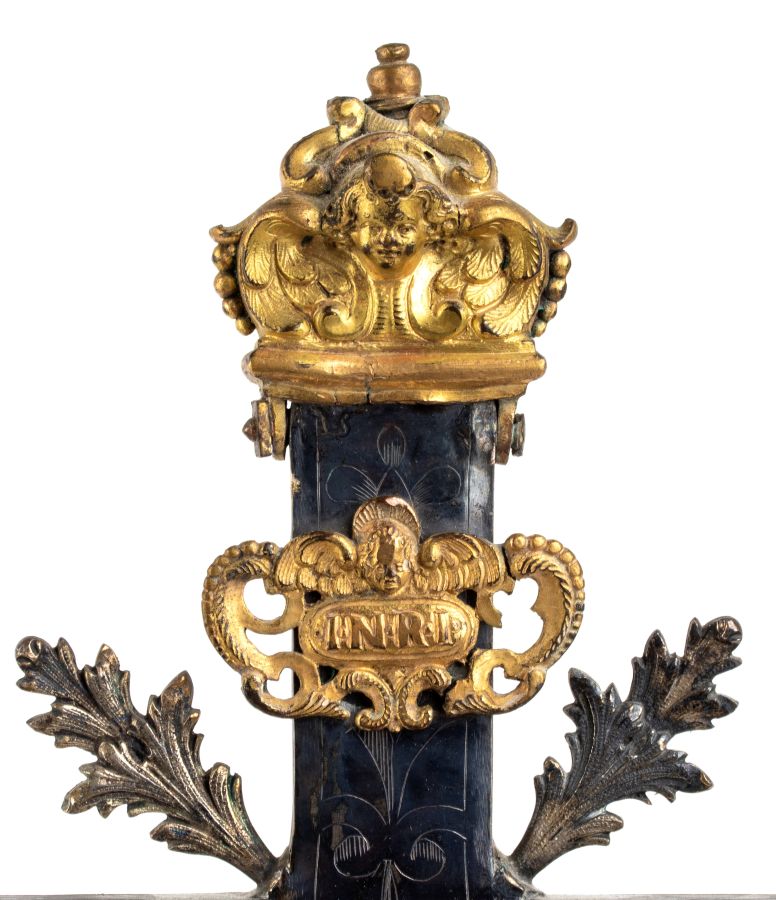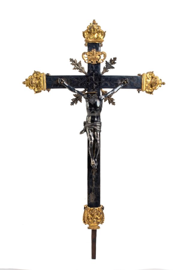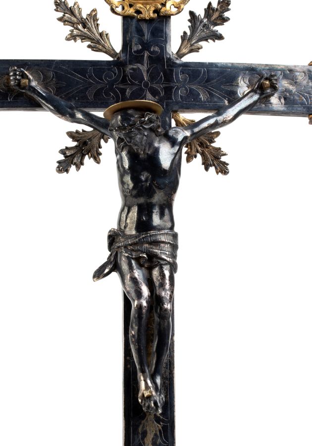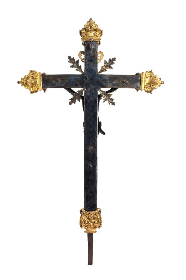 Altezza x larghezza x profondità: 56,5 x 33 c 8 cm. Peso lordo complessivo: 1835 gr. Corpus Christi in argento brunito, montato su una croce in argento; terminali, cimasa e piedicroce in bronzo dorato decorati con cherubini in rilievo e elementi a volute.