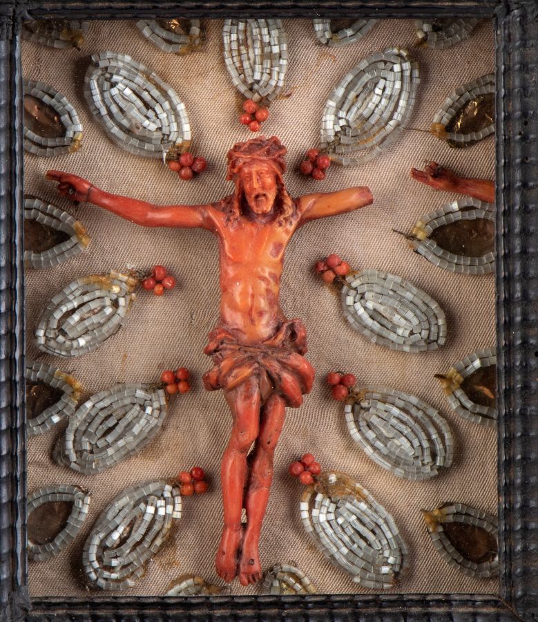 A sostituire la croce, intorno alla figura di Cristo, si trovano numerosi petali di piccole perline in madreperla e fiori formati da piccole sfere di corallo rosso del Mediterraneo (Corallium rubrum).