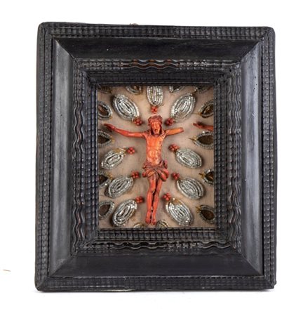 Corpus Christi in corallo rosso del Mediterraneo (Corallium rubrum), inserito in una teca.