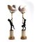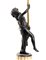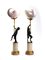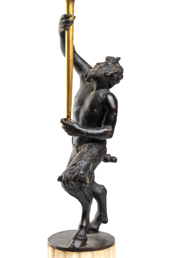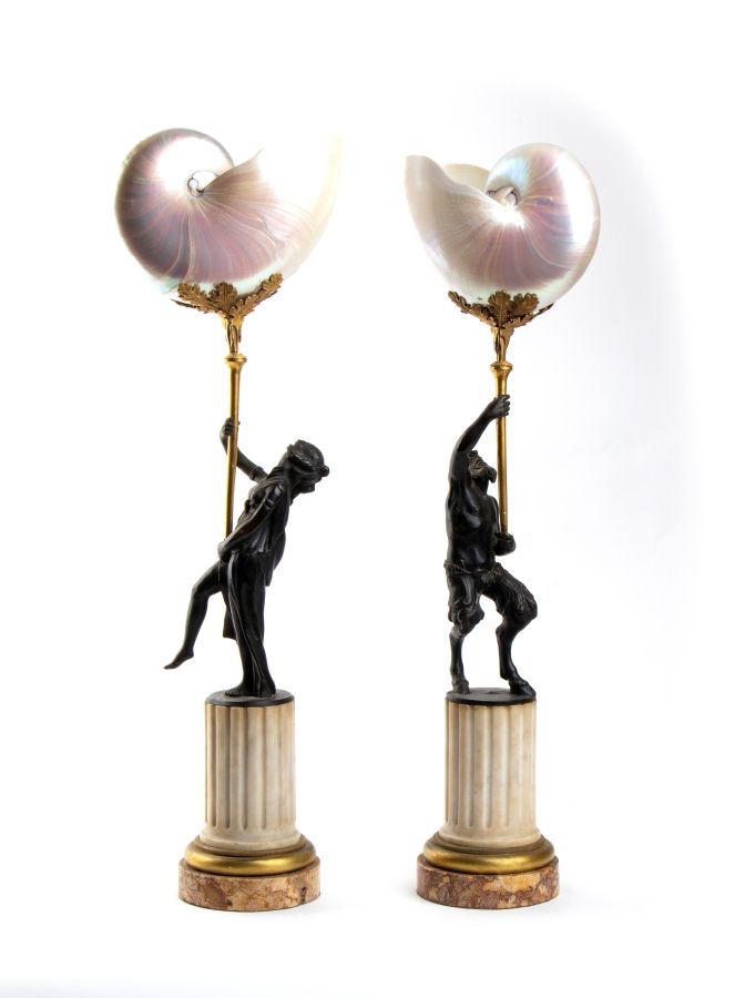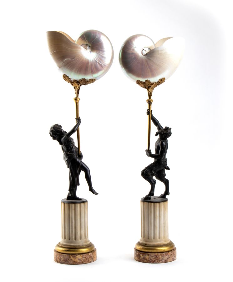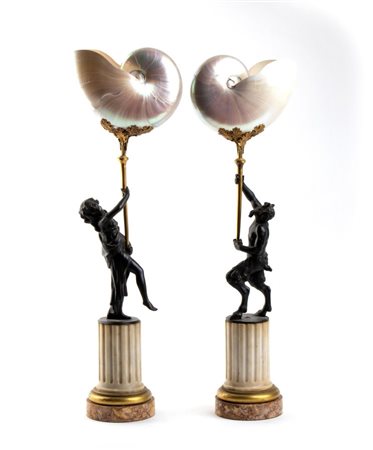 Altezza x larghezza x profondità: 61 x 16 x 9 cm. due figure mitologiche in bronzo patinato scuro, raffiguranti rispettivamente una figura femminile e un satiro, caratterizzati da posture dinamiche e muscolature ben modellate e definite. Ognuna delle figure sostiene con entrambe le mani una fiaccola dorata, su cui è montata una grande conchiglia di Nautilus (Turbo Marmoratus), rifinita alla base da foglie d'acanto in bronzo dorato, tipiche del lessico neoclassico. Le sculture poggiano su basi composte da colonne scanalate in stile corinzio, realizzate in marmo, con elementi dorati e plinti circolari in marmo.