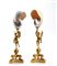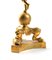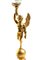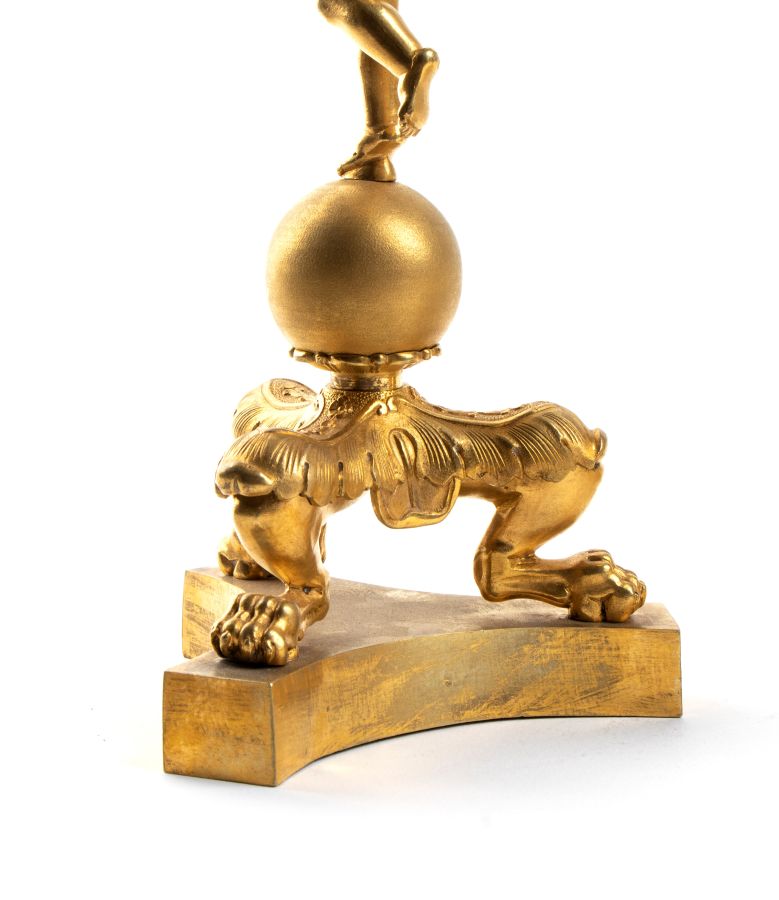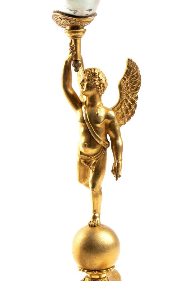 Altezza x larghezza x profondità: 46 x 14 x 13 cm. base geometrica in metallo dorato, su cui insistono tre eleganti zampe leonine, finemente decorate con motivi fitomorfi e culminanti in una sfera liscia. Da essa si innalza la figura di un putto alato, dalle ali spiegate, che solleva con la mano destra la base di una fiaccola, in un chiaro rimando all’iconografia classica della Nike, personificazione della Vittoria. Al posto delle fiamme, tuttavia, è collocata una grande conchiglia (Turbo marmoratus), creando un intreccio tra neoclassico e camera delle curiosità.