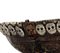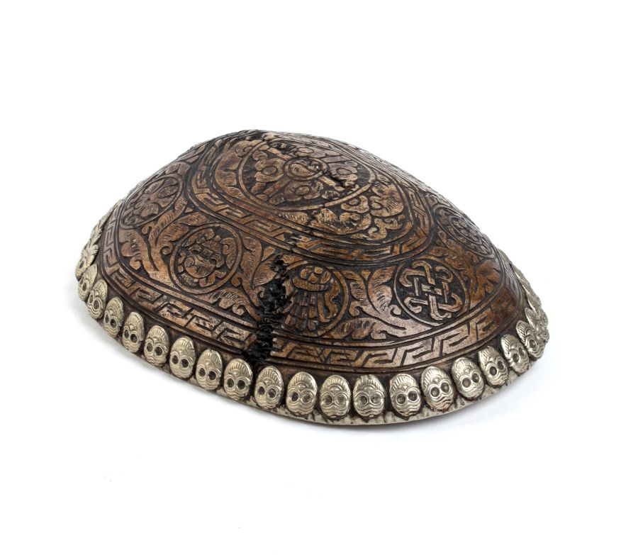Altezza x larghezza x profondità: 17 x 13,5 x 5 cm. Peso: 248 gr. tradizionale coppa rituale tibetana, usata nei rituali tantrici del Buddhismo Vajrayāna, in particolare nelle pratiche associate a offerte sacrificali simboliche. Il bordo esterno della coppa è decorato da una sequenza di piccoli teschi. che richiamano iconograficamente il ciclo della morte e della rinascita, temi centrali nella dottrina buddhista esoterica. L’interno del cranio è completamente rivestito in metallo, sia per ragioni rituali che conservative. La parte superiore del rivestimento presenta due fasce decorative concentriche, finemente incise con motivi che possono includere elementi floreali stilizzati, simboli tantrici o iconografie sacre, distribuite in modo ordinato.