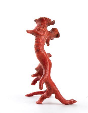 Altezza x larghezza x profondità: 12 x 8 x 8 cm. Peso: 70 gr. ramo di corallo rosso del Mediterraneo (Corallum Rubrum), scolpito a raffigurare un cavalluccio marino.