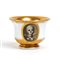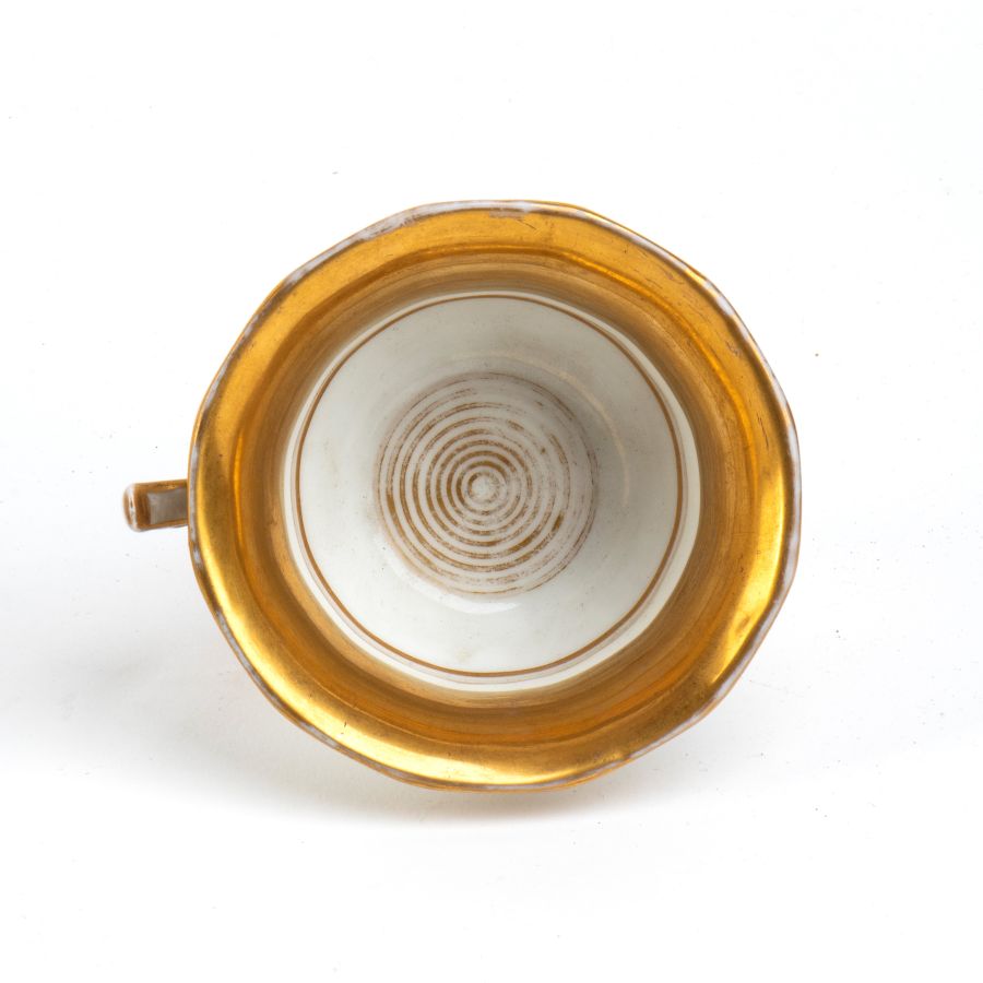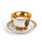Altezza x diametro tazza: 8,3 x 11,5 cm. Diametro piatto: 18 cm. Peso complessivo: 480 gr. tazzina con bocca svasata, profilo scanalato e dettagli dorati, e da un piattino abbinato con decori coordinati.