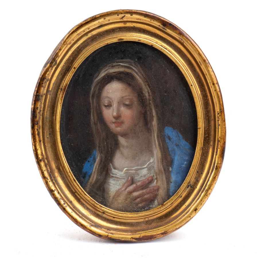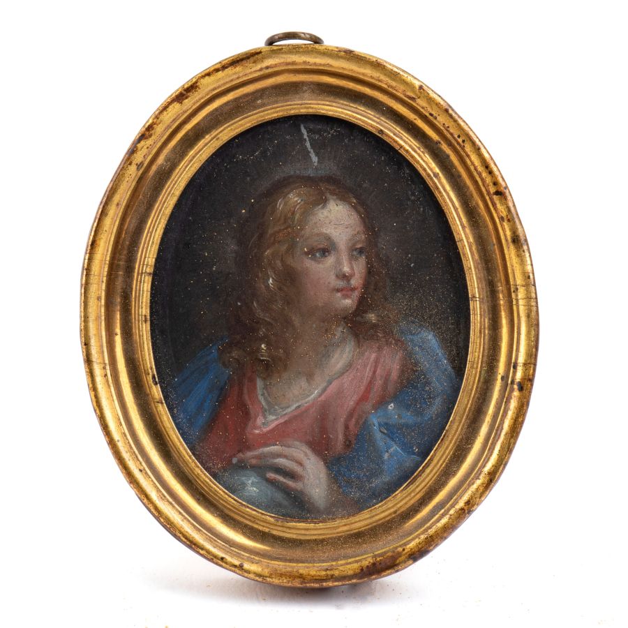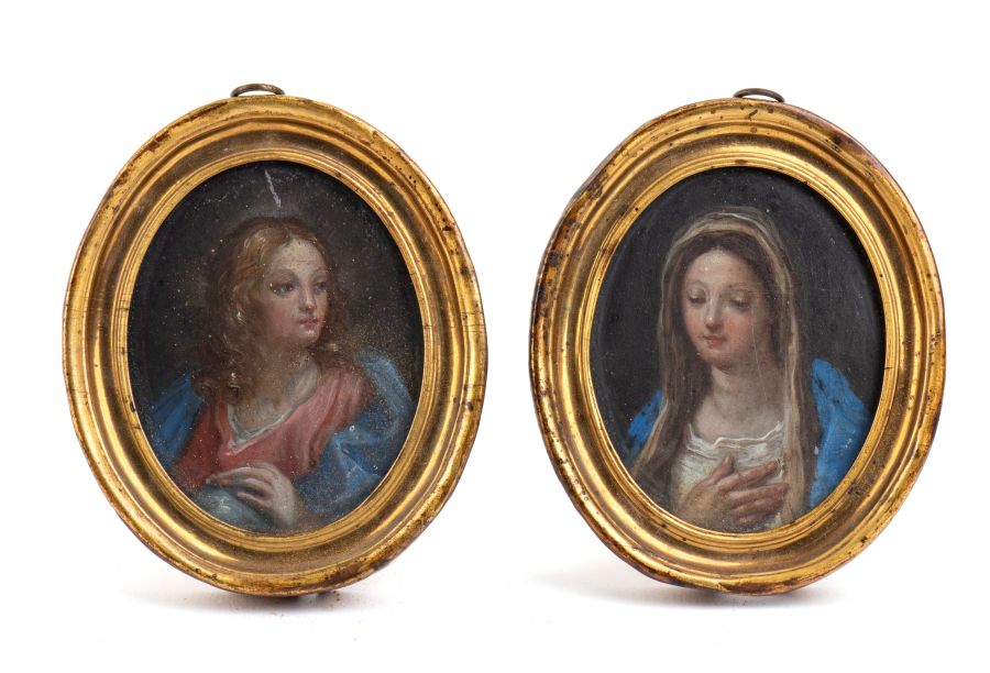 Altezza x larghezza: 11,5 x 9,5 cm. Peso complessivo: 160 gr. raffiguranti uno San Giovanni Evangelista e uno la Vergine; incorniciati in lamierino dorato.