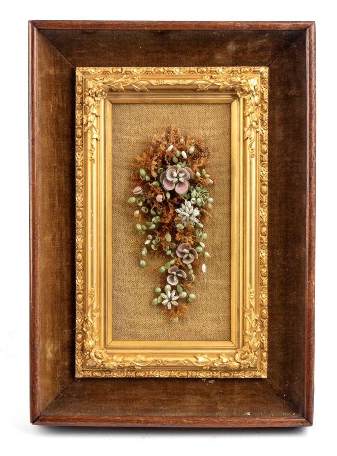 Altezza x larghezza: 31 x 22 cm. nell’epoca vittoriana in Inghilterra era comune regalare per San Valentino oggetti decorativi con conchiglie, come cornici, scatoline o cuori ornamentali. Questi manufatti erano spesso realizzati a mano: le conchiglie erano viste come segni di amore duraturo e bellezza eterna.