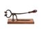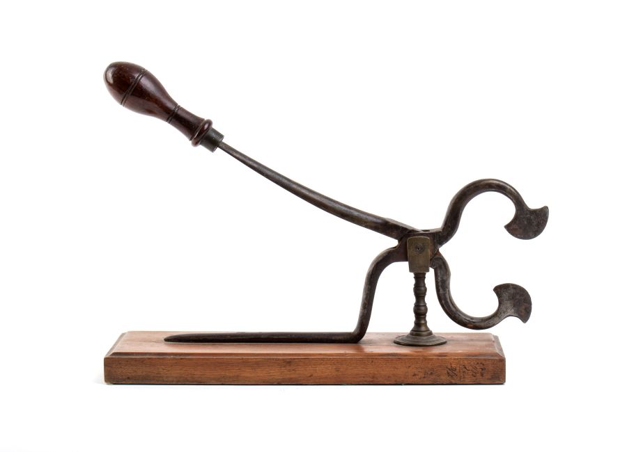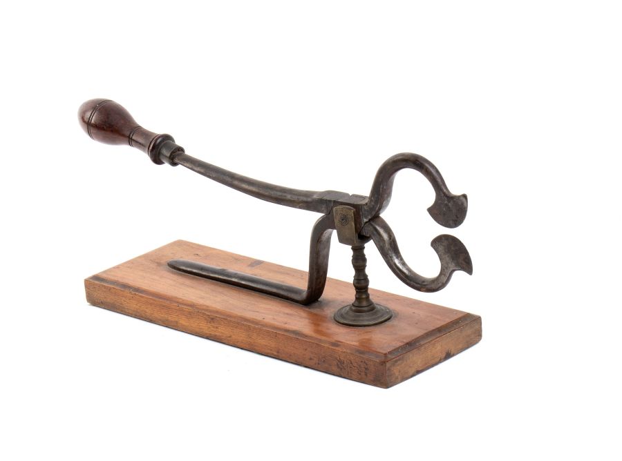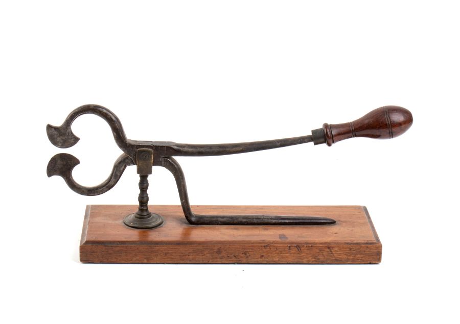 Altezza x larghezza x profondità: 15 x 36 x 10,5 cm. Peso complessivo: 120 gr. in ferro battuto con manico in legno tornito, su base in legno. Nel periodo vittoriano lo zucchero veniva venduto in grandi blocchi duri, detti "coni di zucchero", e per spezzarlo in porzioni più piccole si utilizzava una speciale pinza taglia-cristalli. Questo strumento, spesso in metallo robusto con manici decorativi, come in questo caso, era presente in molte case borghesi ed era considerato sia utile che elegante.