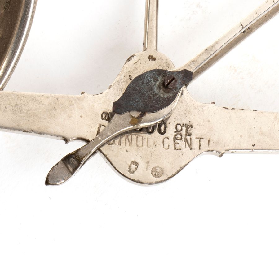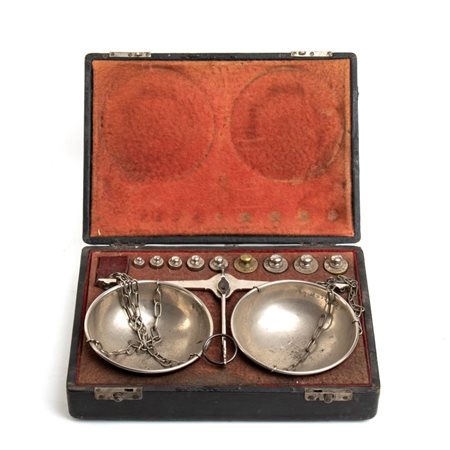 altezza x larghezza x profondità scatola: 7 x 28 x 20 cm. Peso complessivo con scatola: 1796 gr. strumento di precisione utilizzato dagli orafi per pesare piccole quantità di metalli preziosi e pietre. Presenta due bracci uguali, con due piattini sospesi a catena. È custodita in una teca di legno per proteggerla da correnti d’aria e polvere, elementi che potrebbero influenzare la precisione del peso. Il contrappeso era calibrato in grammi o carati, e l’equilibrio veniva regolato con estrema attenzione, riflettendo l’alta sensibilità dello strumento. All'interno della scatola, oltre alla bilancia stessa, si trovano i pesetti calibrati. Questi pesetti erano realizzati con estrema cura e marcati con valori in grammi o carati, per garantire una misurazione precisa.