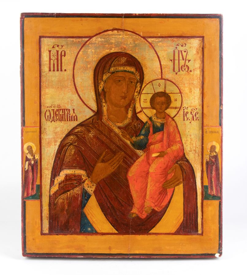 Altezza x larghezza x profondità: 54 x 44 x 5 cm. La Madonna di Smolensk appartiene al tipo fondamentale di raffigurazione della Vergine Odigitria, intesa come “Colei che mostra il cammino” di cui forse è il tipo più diffuso e popolare in Russia. La Vergine conserva la solennità che contraddistingue il canone della Vergine Odigitria, è presentata frontalmente con il capo dolcemente inclinato verso il figlio, seduto sul braccio sinistro, la mano sinistra protesa verso Gesù Cristo.