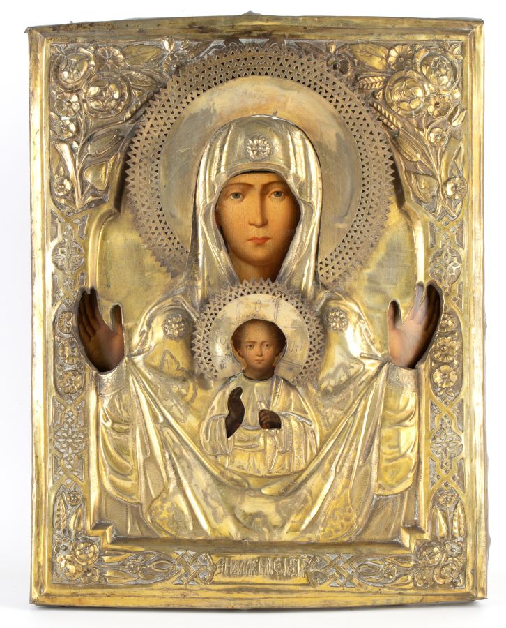 Icona russa con riza raffigurante Madre di Dio del Segno XX secolo