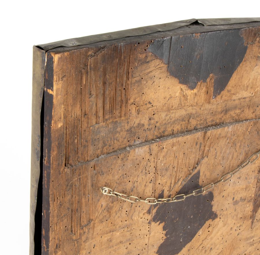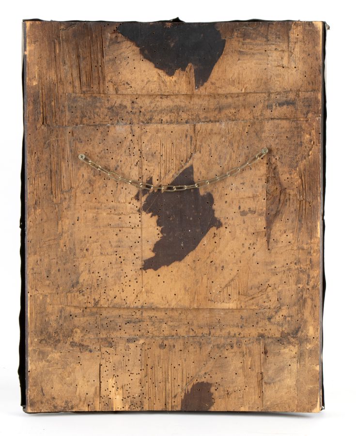 Altezza x larghezza: 44,5 x 35,5 cm. questa iconografia ha origini nelle prime raffigurazioni cristiane nelle Catacombe, ispirandosi all’iconografia pagana dell’Orante, dove Maria viene presentata a mezzo busto con le braccia alzate e le mani aperte con i palmi verso l'alto, simbolo di preghiera e adorazione. Davanti a Lei, sul petto, in un medaglione, si trova il Bambino che benedice con il gesto trinitario con la mano destra, mentre con la sinistra tiene il rotolo delle Scritture.