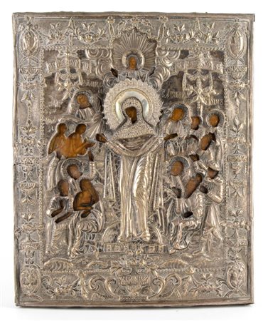 Icona russa con riza raffigurante la Madre di Dio gioia di tutti gli afflitti. XIX secolo