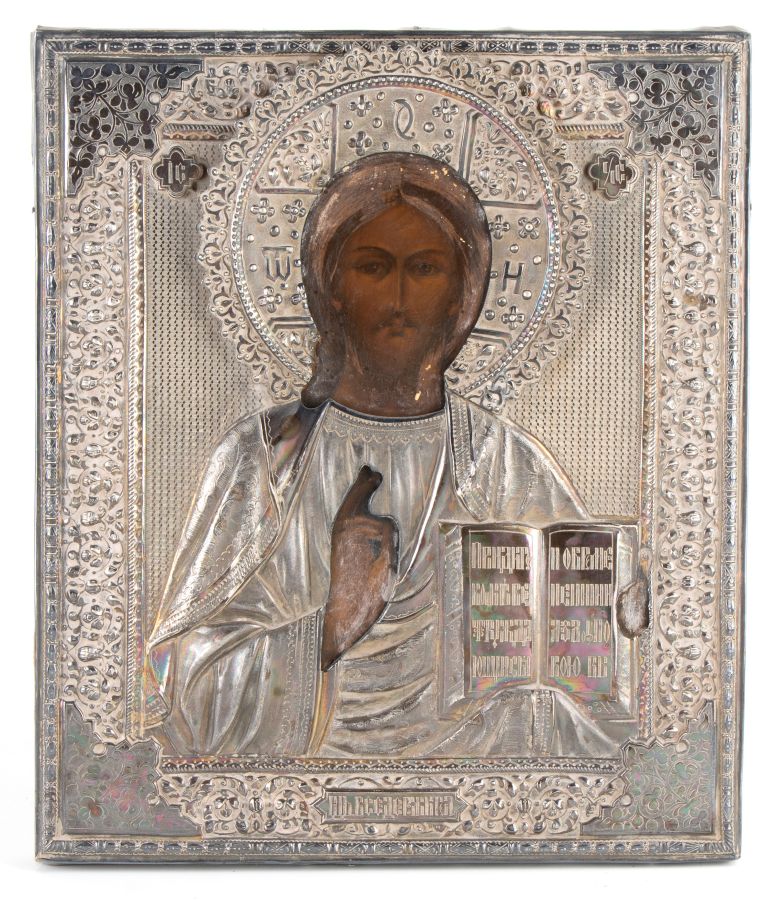Icona russa con riza in argento raffigurante Cristo Pantocratore Mosca, 1899-1908