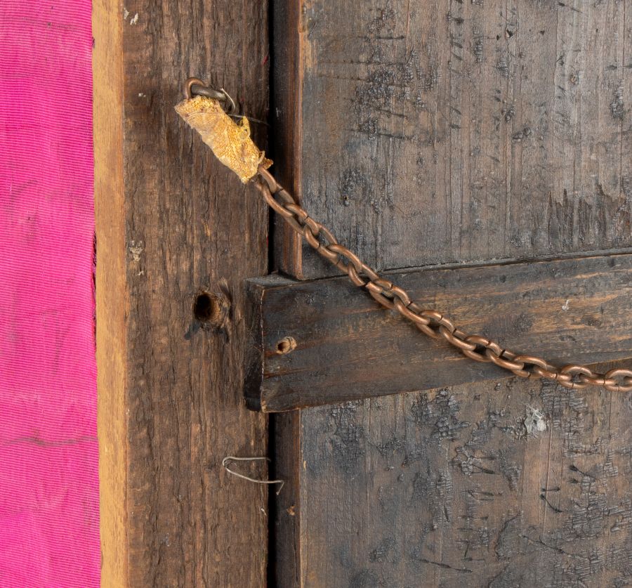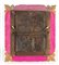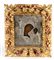 Riza in metallo e cornice in legno decorata con grappoli d'uva e viti.