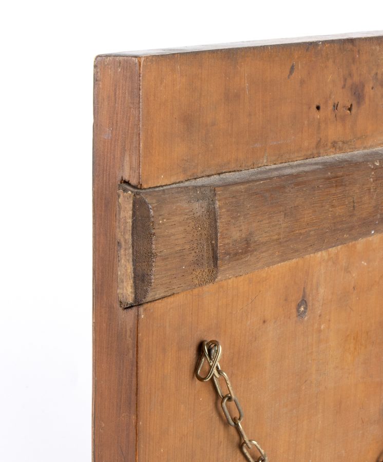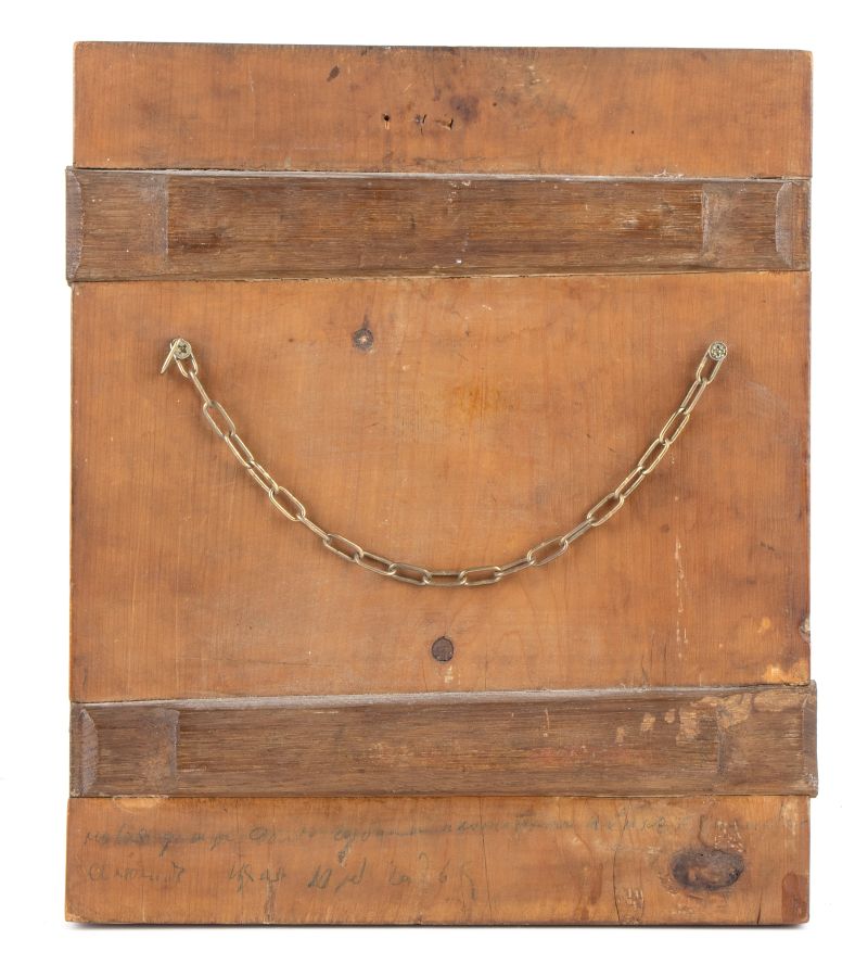 Altezza x larghezza x profodità: 31,5 x 27 cm. La Vergine è posta al centro, in trono, colta mentre avvolge Gesù Bambino, stante e a figura intera. Ai loro lati sono raffigurati quattro santi della chiesa Ortodossa. Decorata con tempera su tavola, sfondo dorato e decorazioni geometriche.