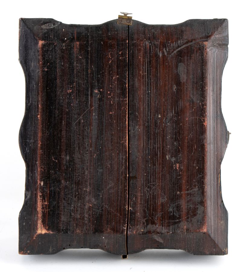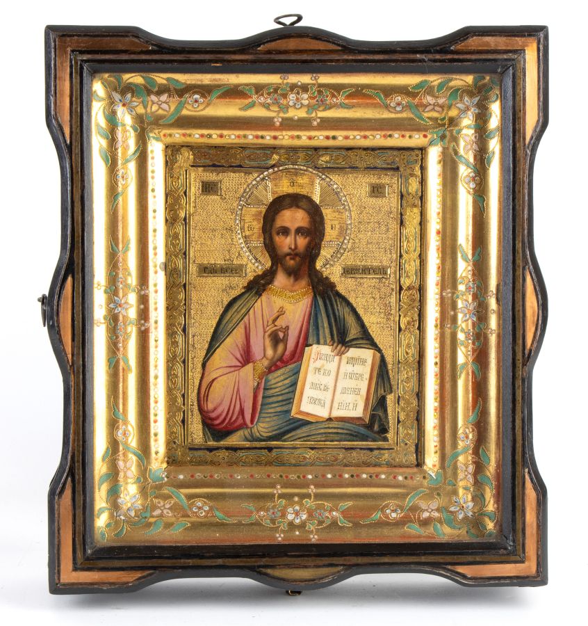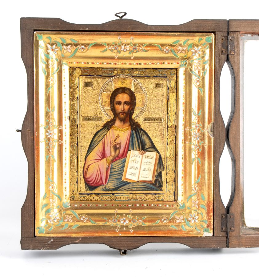 Altezza x larghezza x profondità con teca: 28 x 25,5 x 7 cm. entro una teca lignea, l'icona raffigura Cristo Benedicente, una delle immagini più sacre e diffuse nella tradizione ortodossa. Il termine Pantocratore, "Onnipotente", sottolinea il ruolo di Cristo come Giudice e Signore dell'universo. Cristo è raffigurato frontalmente, con uno sguardo solenne e barba sottile. La mano destra è alzata nel segno della benedizione; nella mano sinistra, invece, tiene il Vangelo, aperto. Lo sfondo, riccamente decorato, presenta dorature e ghirlande floreali.