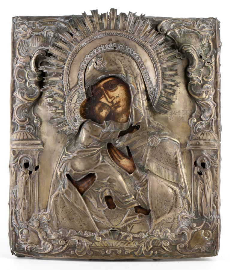 Icona russa con riza raffigurante Madonna con Bambino XIX secolo