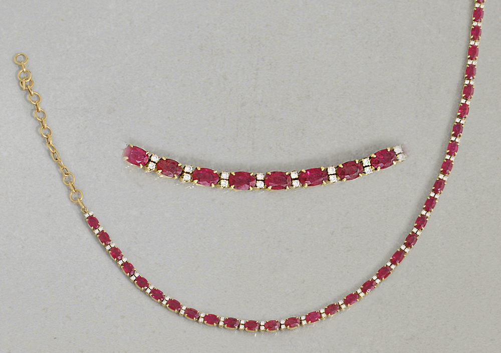 COLLANA. In oro giallo 18 kt interamente percorsa da rubini taglio ovale per tot. cts. 23,00 ca. intercalati da diamanti taglio brillante per tot. cts. 1,60 ca., chiusura regolabile.