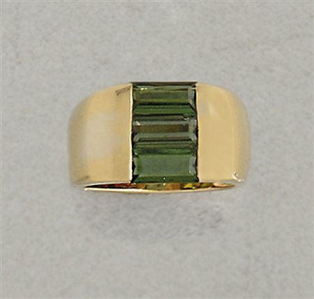ANELLO. In oro giallo 18 kt con al centro tre gemme verdi taglio rettangolare (prob. tormaline verdi).