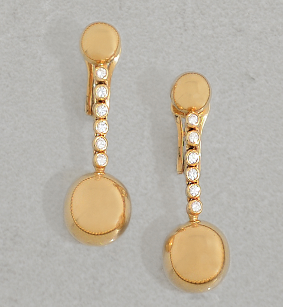 COPPIA DI ORECCHINI DI DE GRISOGONO. In oro giallo 18 kt perno ripieghevole e clip, motivi a demiboules con settori verticali in diamanti taglio brillante per tot. cts. 0,40 ca. terminanti con settori a sfere lisce.