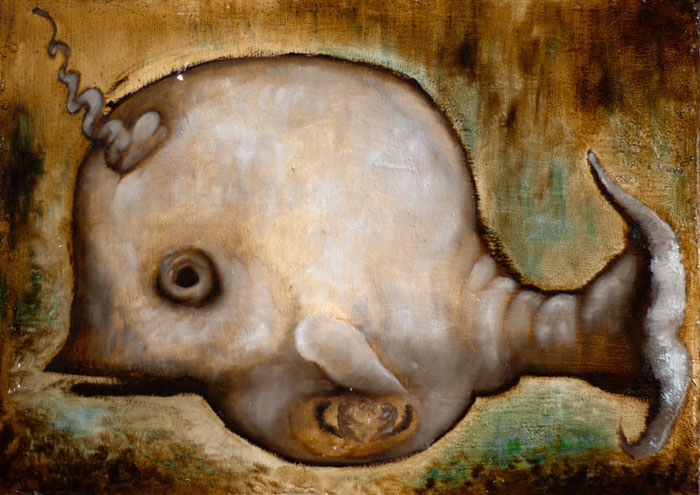 GIULIO ROSSI Massa Carrara 1988 GIONA E GEPPETTO DENTRO LA STESSA BALENA, ASPETTANDO L'UNA IL FIGLIO E L'ALTRA DIO N.D. Olio su tavola 50x70 Certificato di autenticità