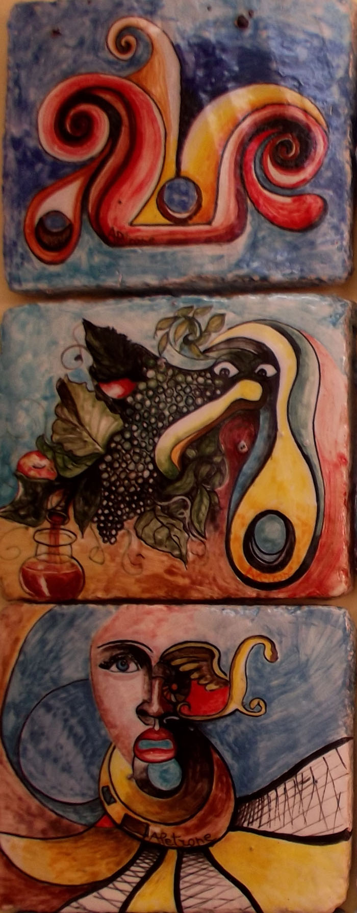 ANDREA PETRONE Napoli 1952 LA CASA DEL MAGO (2) 2014 N. 3 maioliche smaltate (cm 14 x 17 cad.) 42x17 Certificato di autenticità