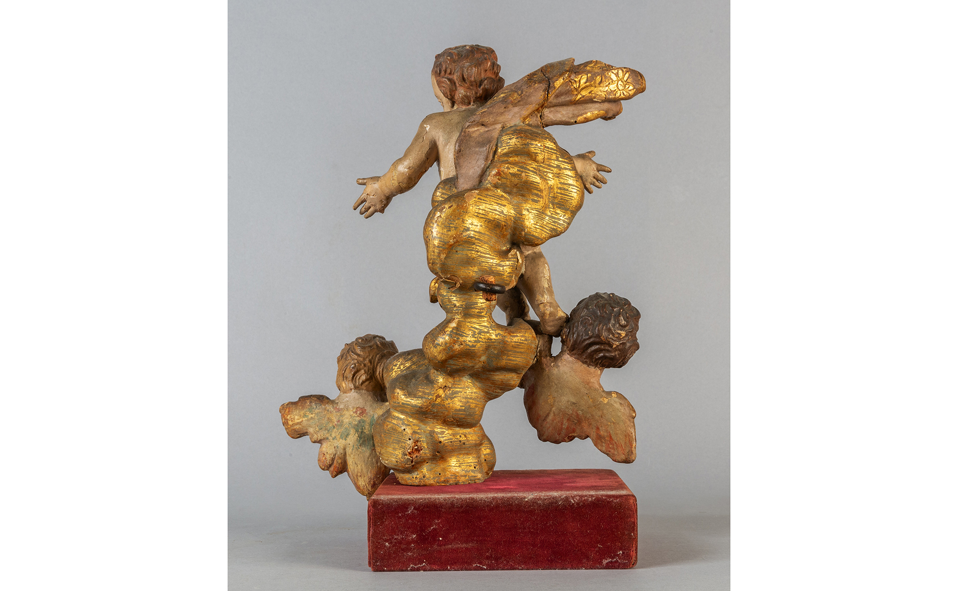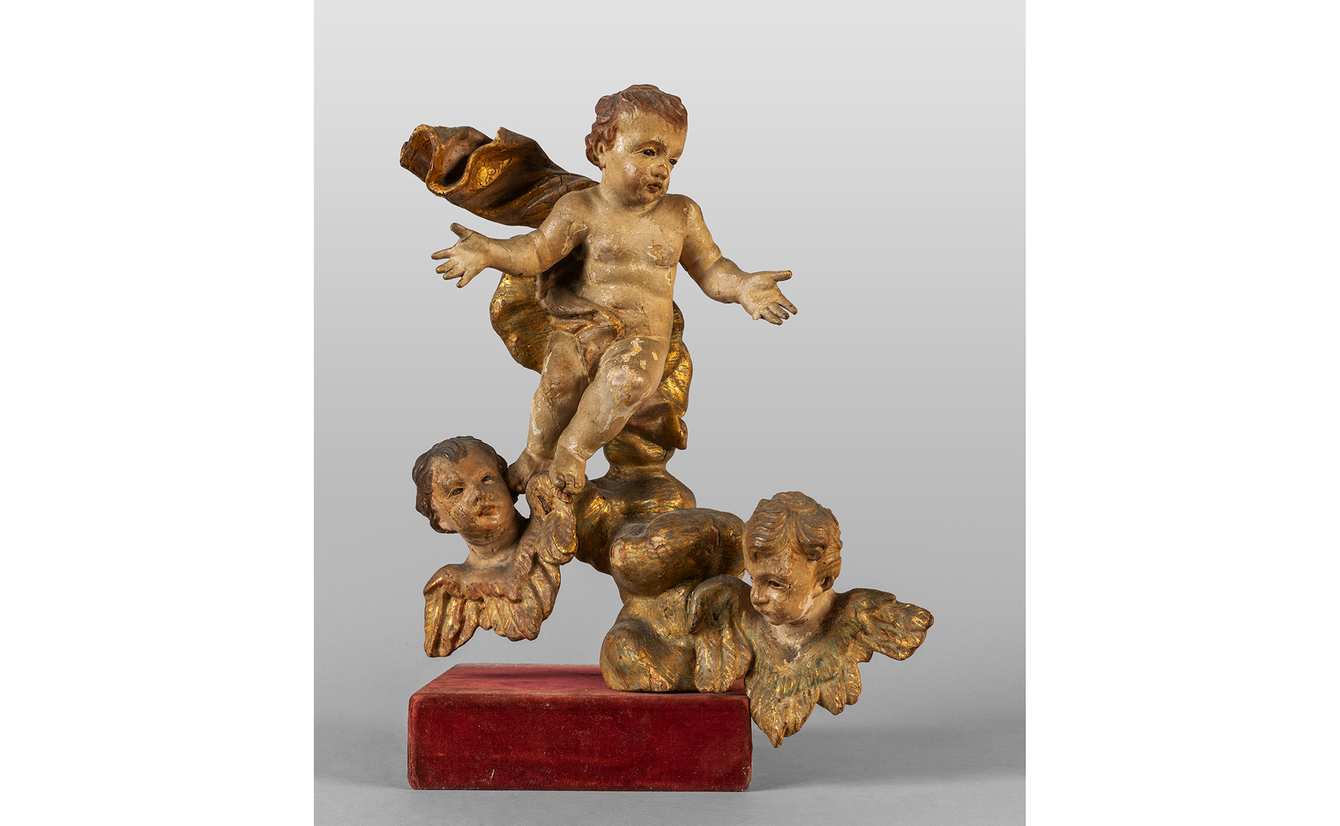 Gruppo di tre angioletti in legno intagliato dorato e laccato Genova sec.XVIII