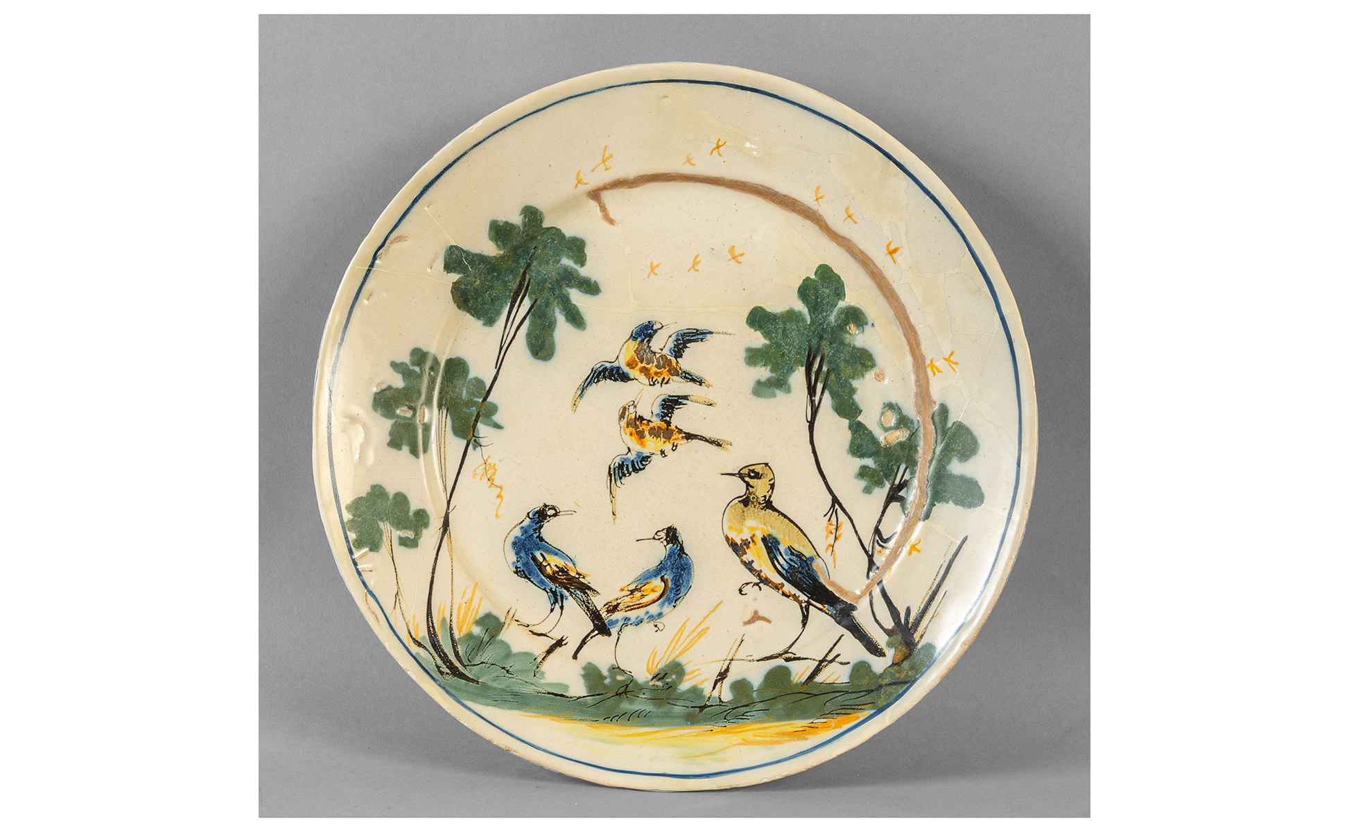 Grande piatto in ceramica decorata in policromia con volatili marca L.L. con il globo Savona sec.XVIII