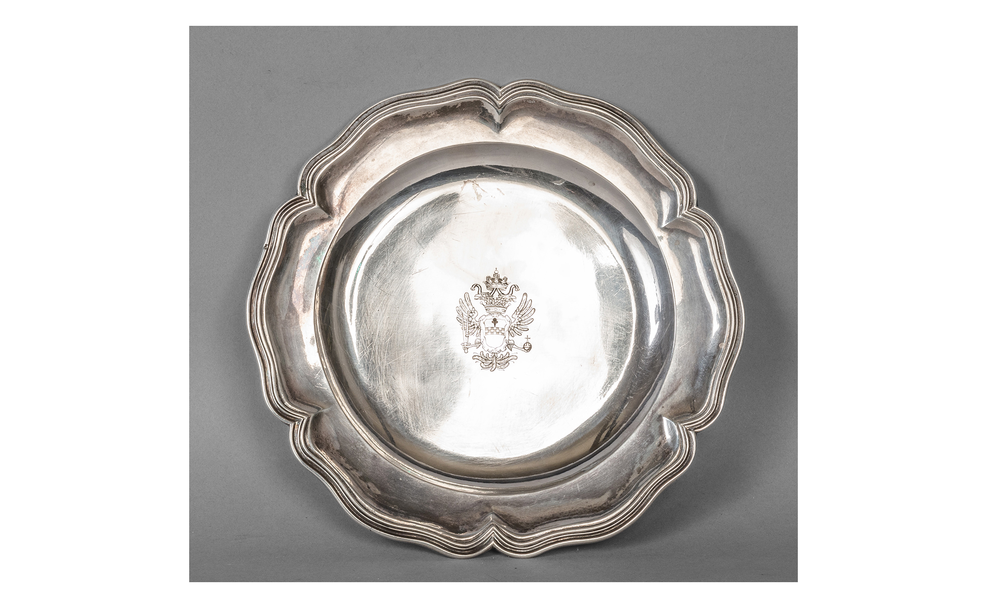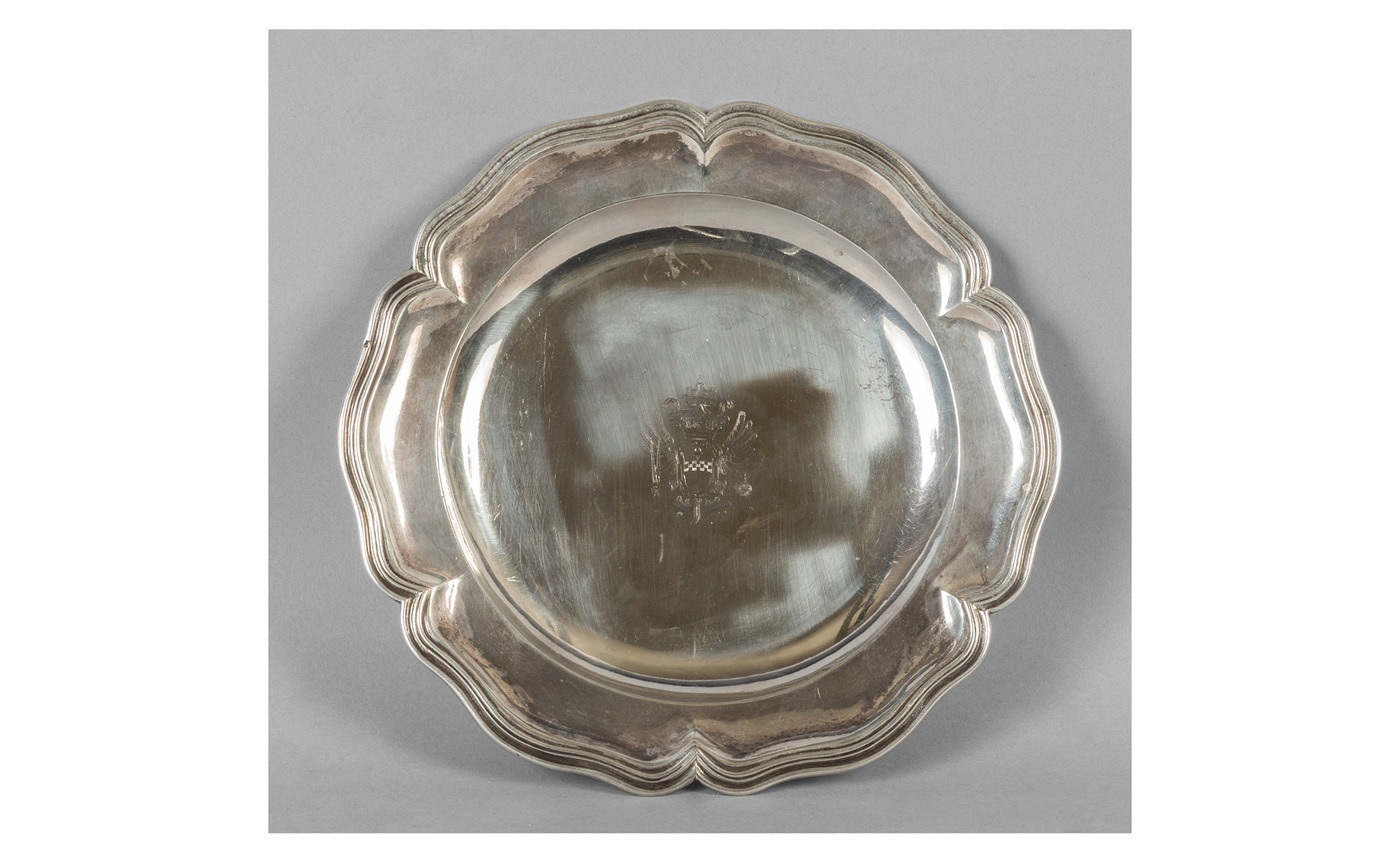 Piatto in argento Luigi XV nel cavetto stemma araldico Genova punzone della Torretta sec.XVIII