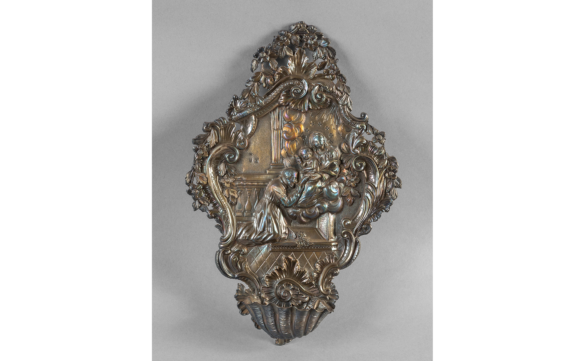 Acquasantiera in argento sbalzato con al centro la Madonna con il Bambino e San Gaetano di Tiene (detto il Santo) Genova punzone della Torretta metà sec.XVIII