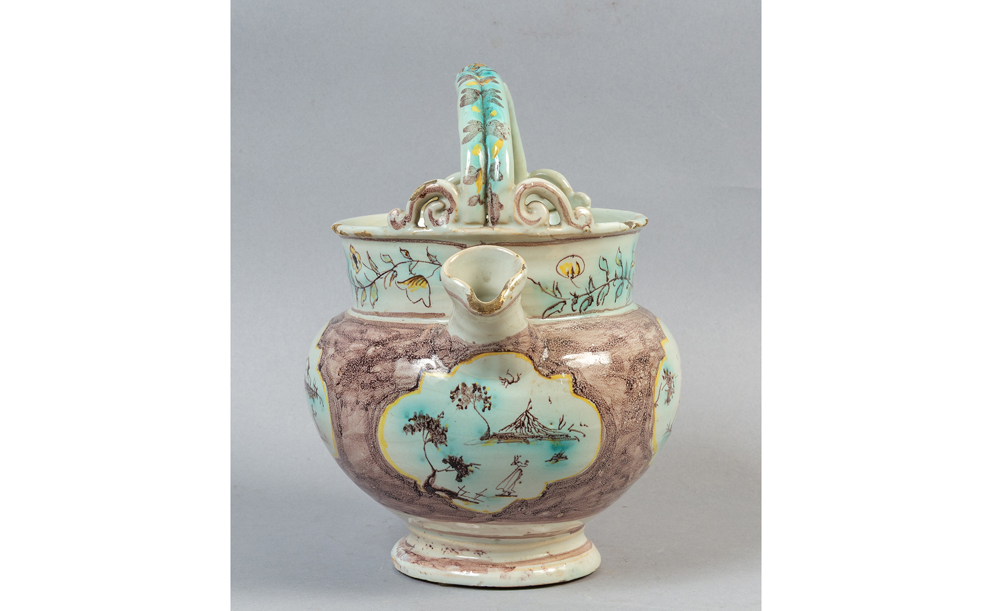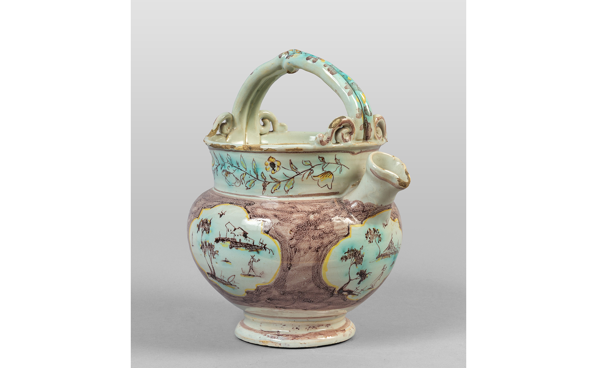 Versatoio in ceramica decorato in policromia con riserve a paesaggi marca Lanterna sec.XVIII