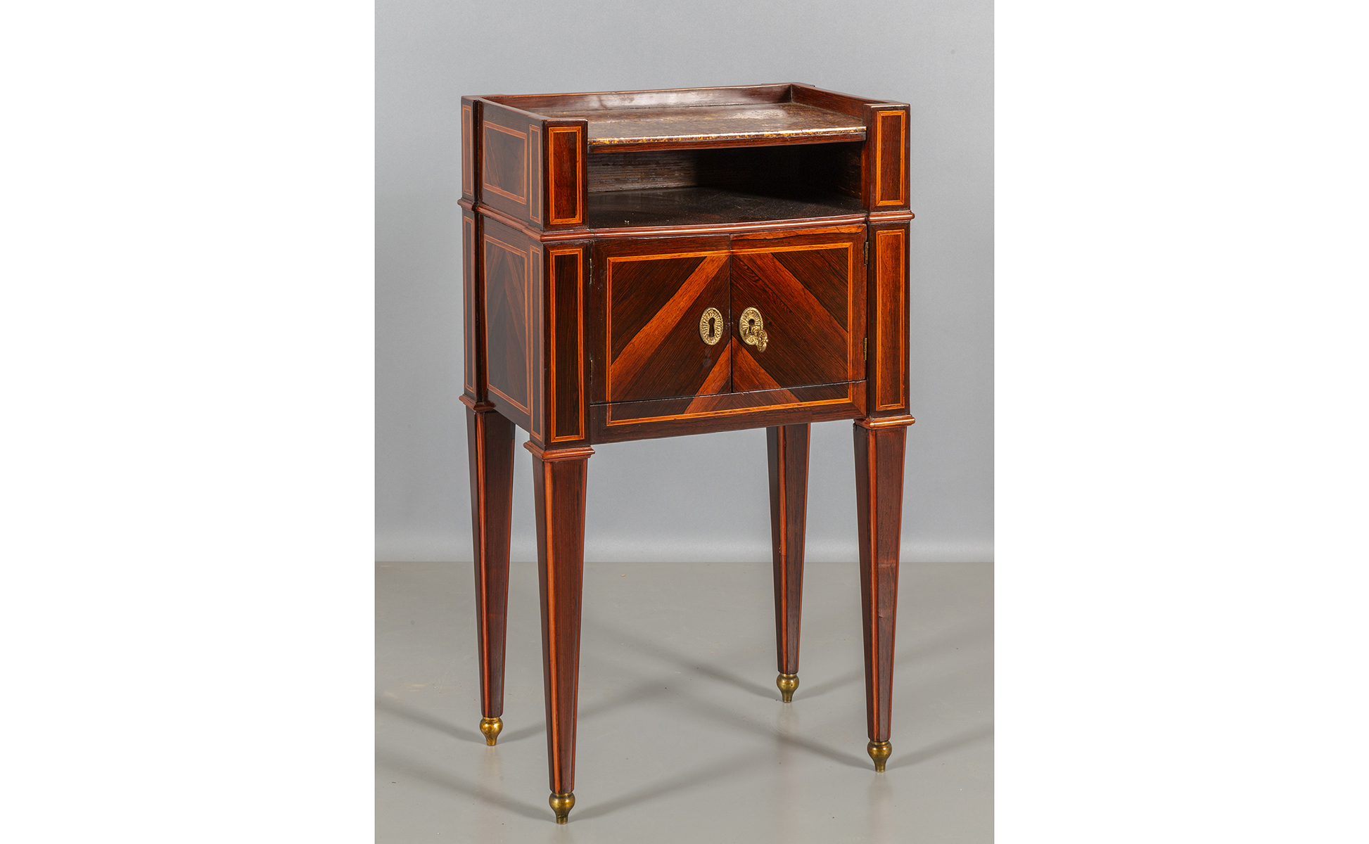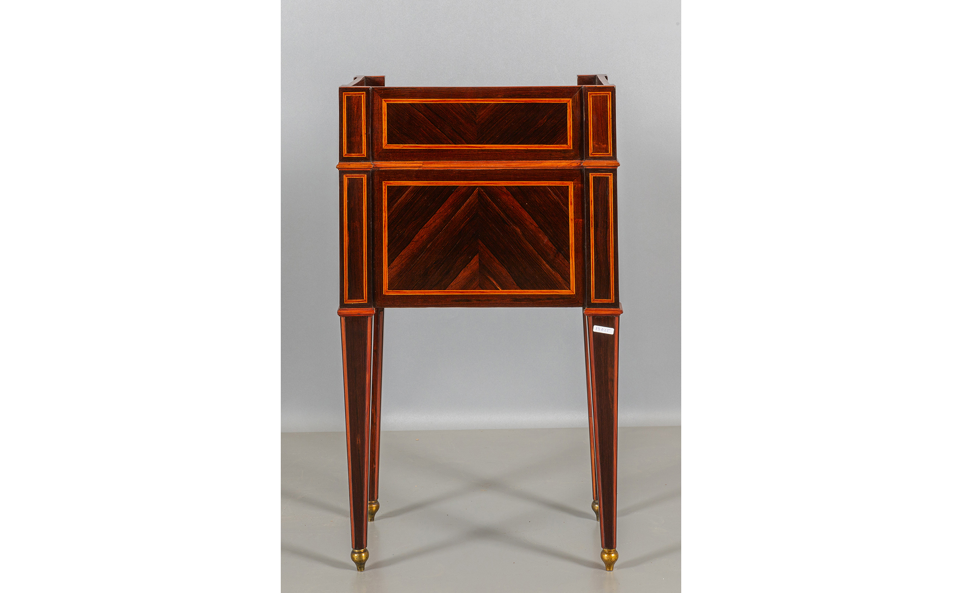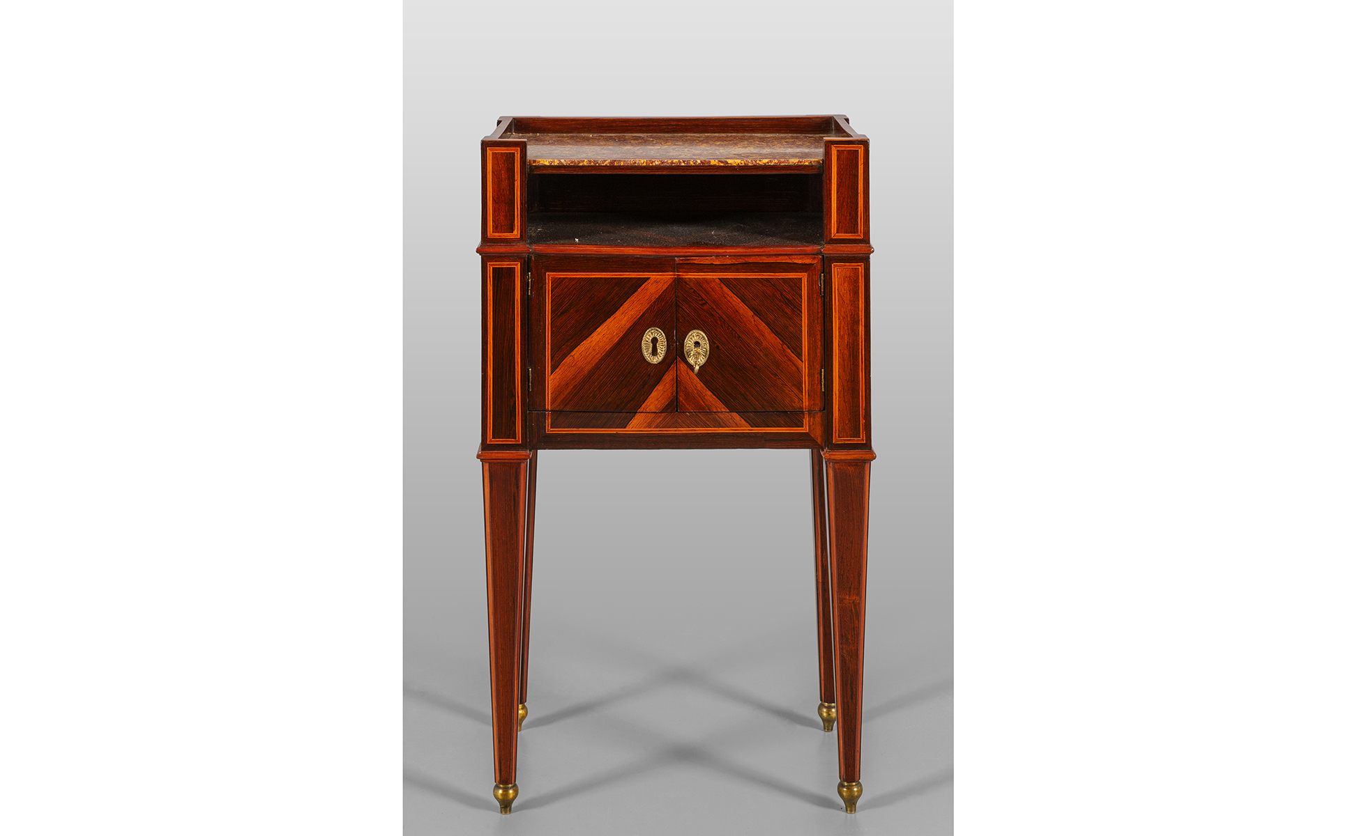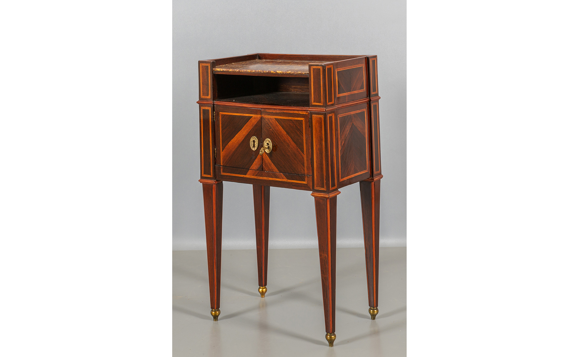Comodino Luigi XVI lastronato in palissandro e bois de rose due sportelli nella fascia piano in broccatello Genova II metà sec.XVIII