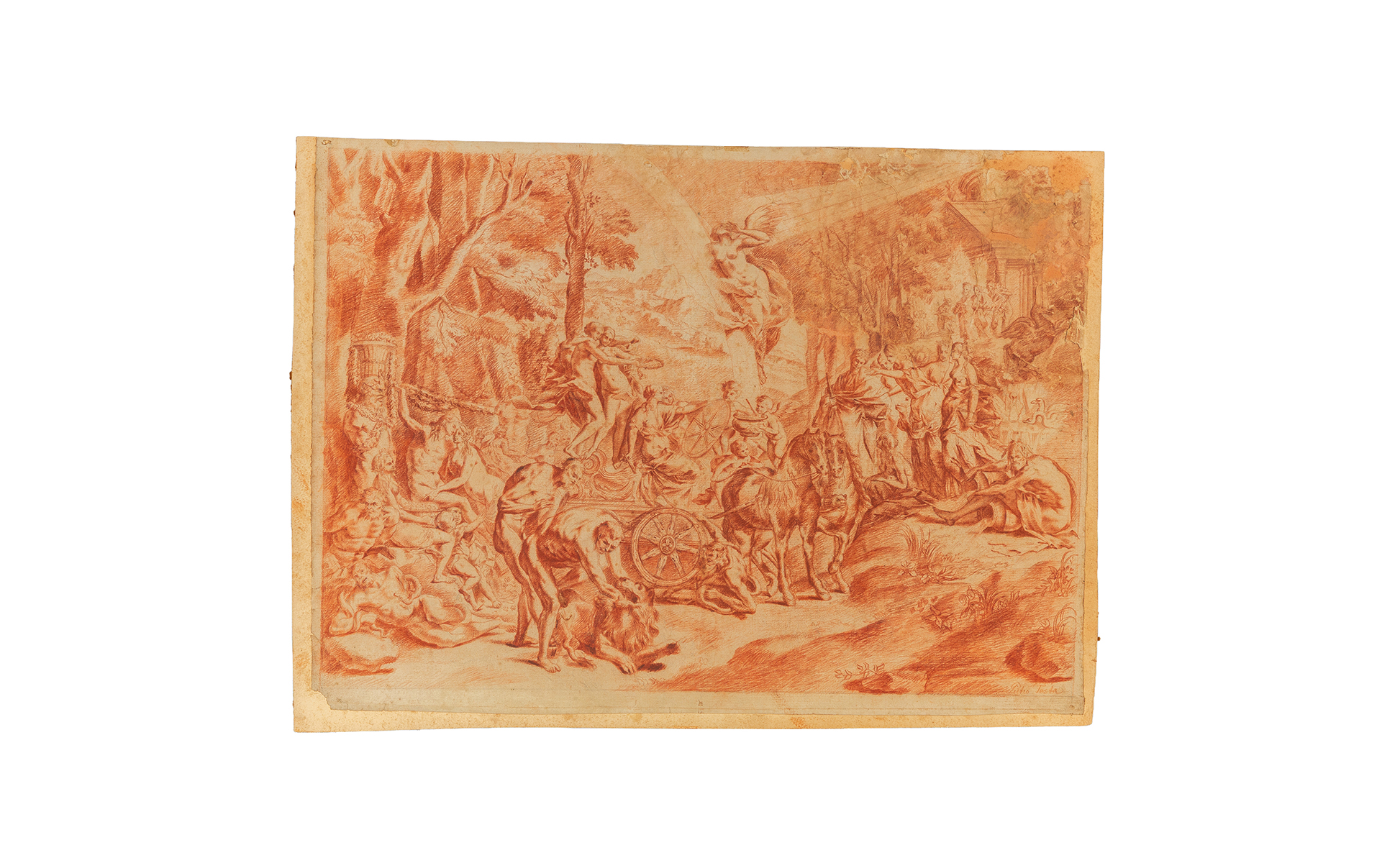 'Il carro del trionfo' sanguigna su carta vergellata con filigrana incollata su cartoncino f.to in b. a ds.
